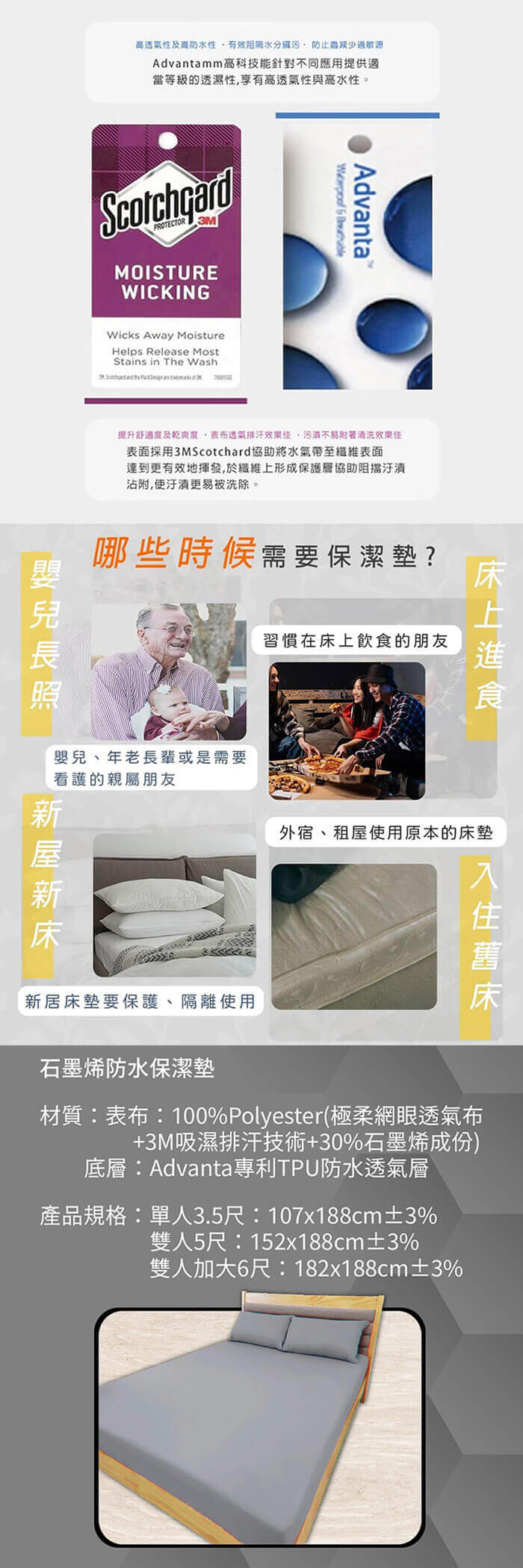 - 材質/食材:表布:100%polyester(極柔網眼透氣布+3M吸濕排汗技術+30%石墨烯成份 底層:Advanta專利技術TPU防水透氣層