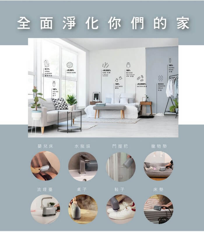- 配件:移動式水箱×1、防水垢濾芯×1、織物防護底板×1、非織物防護底板×1、防燙手套×1、防塵套×1