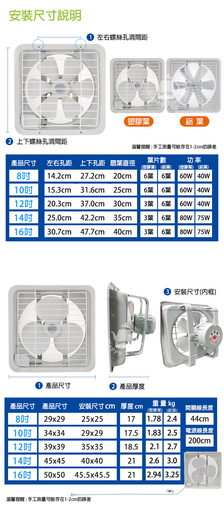 - 主商品尺寸/規格/重量:◎ 型號:FC-314 ◎ 扇葉尺寸:35CM ◎ 額定電壓 / 頻率:110V / 60Hz ◎ 消耗功率:80W ◎ 重量:(約) 2.6 kg ◎ 吸排開關長度:(約)44 cm ◎ 電線長度:(約)200 cm ◎ 產品尺寸:長45 x 寬45 x 厚21 cm ◎ 安裝尺寸:長40 x 寬40 cm ◎ 包裝尺寸:45 x 20 x 45 cm ◎ 認證號碼:R63025 ◎ 產地:台灣 ◎ 保固:一年