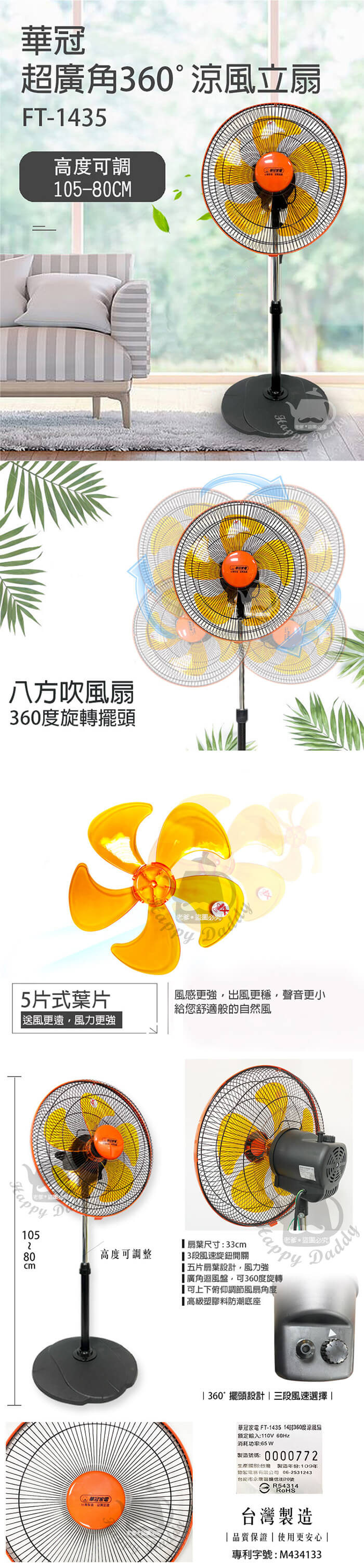 - 主商品尺寸/規格/重量:產品名稱 : 華冠14吋360度風扇 產品型號 : FT-1435 額定電壓 : AC110V / 60Hz 消耗功率 : 65W 產品淨重 : 約2.7KG 產品毛重 : 約3.6KG 產品尺寸 : (高)105~80cm x (底座寬)42cm x (風扇頭)40cm 外箱尺寸 : 58x14.2x43.6 cm 產品產地 : 台灣 電檢字號 : R54314 專利字號 : M434133