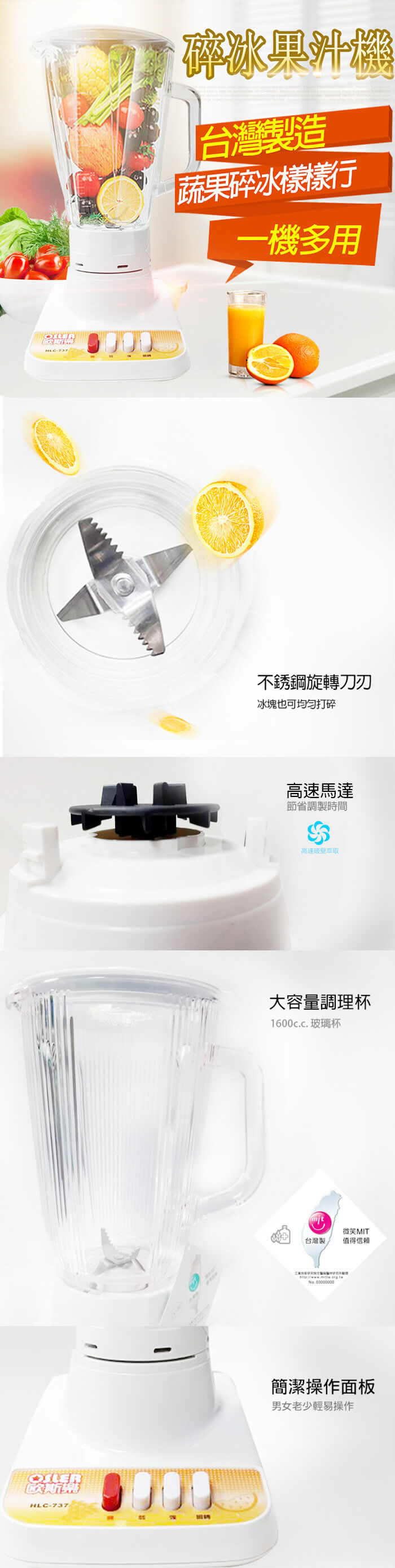 - 主商品:【歐斯樂】1600c.c玻璃杯碎冰果汁機HLC-737*1