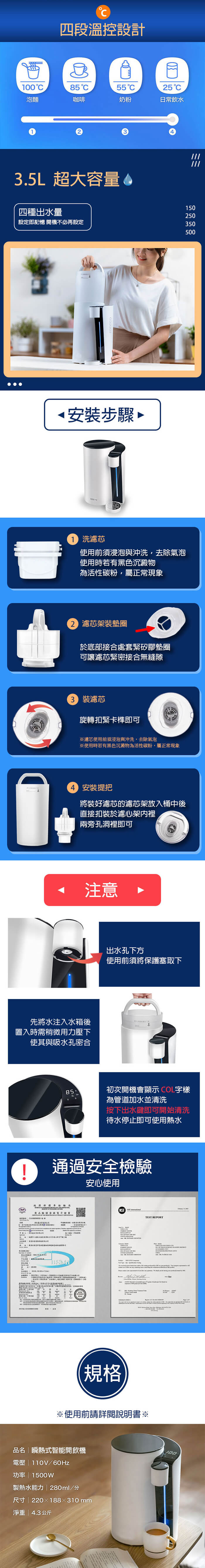 - 主商品尺寸/規格/重量:電壓:110V/60Hz 功率:1500W 製熱水能力:280ml/分 水箱容量:3.5L 出水量:150/250/350/500 ml 溫度設定:25/55/85/100 度 產品尺寸:長220 x 寬188 x 高310 mm 包裝尺寸:275 x 230 x 370 mm 重量:4.3kg 內容物:瞬熱式智能開飲機+濾芯+接水盤+桶蓋+說明書 保固:一年 產地:中國 認證字號:R41290