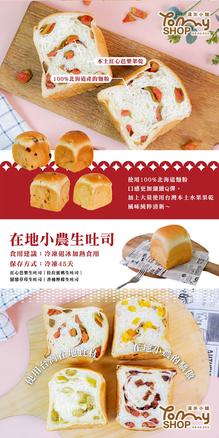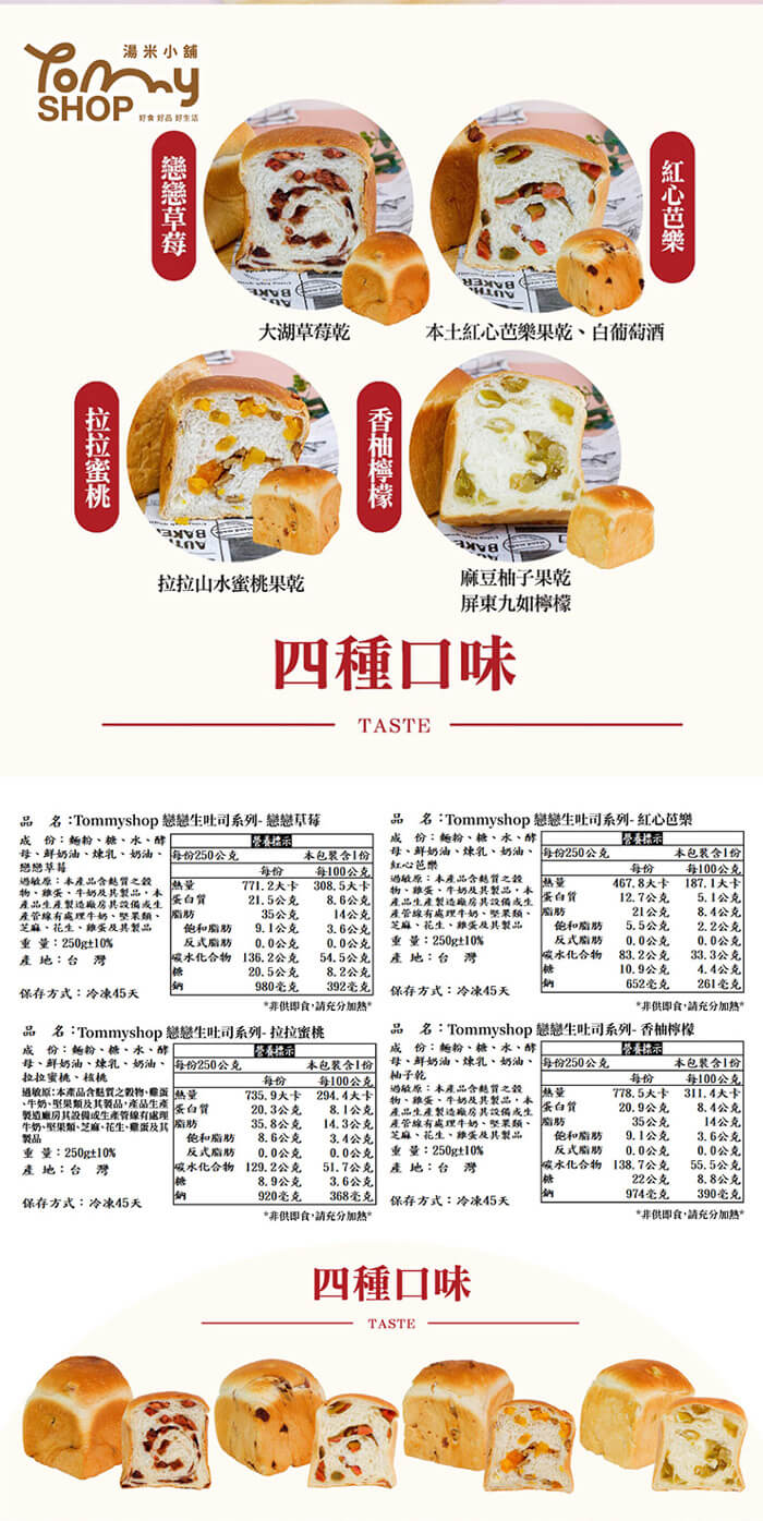 - 主商品產地:【Tommyshop】戀戀生吐司-紅心芭樂(250g/入) 成分:粉、糖、水、酵母、鮮奶油、煉乳、奶油、紅心芭樂 營養標示:每份熱量467.8Kacl、蛋白質12.7g、脂肪21g、飽和脂肪5.5g、反式脂肪0g、碳水化合物83.2g、糖10.9g、鈉652mg 淨量:250g±10% 保存期限:45天(係指未開封前在-18度C以下可保存天數) 保存條件:須冷凍於-18度C以下 過敏原資訊:本產品含麩質之穀物、雞蛋、牛奶及其製品,本產品生產製造廠房其設備或生產管線有處理牛奶、堅果類、芝麻、花生、雞蛋及其製品 原產地:台灣 【Tommyshop】戀戀生吐司-拉拉蜜桃(250g/入) 成分:麵粉、糖、水、酵母、鮮奶油、煉乳、奶油、拉拉蜜桃、核桃 營養標示:每份熱量735.9Kacl、蛋白質20.3g、脂肪35.8g、飽和脂肪8.6g、反式脂肪0g、碳水化合物129.2g、糖g8.9、鈉920mg 淨量:250g±10% 保存期限:45天(係指未開封前在-18度C以下可保存天數) 保存條件:須冷凍於-18度C以下 過敏原資訊:本產品含麩質之穀物、雞蛋、牛奶、堅果類及其製品,本產品生產製造廠房其設備或生產管線有處理牛奶、堅果類、芝麻、花生、雞蛋及其製品 原產地:台灣 【Tommyshop】戀戀生吐司-香柚檸檬(250g/入) 成分:麵粉、糖、水、酵母、鮮奶油、煉乳、奶油、柚子乾 營養標示:每份熱量778.5Kacl、蛋白質20.9g、脂肪35g、飽和脂肪9.1g、反式脂肪0g、碳水化合物138.7g、糖22g、鈉974mg 淨量:250g±10% 保存期限:45天(係指未開封前在-18度C以下可保存天數) 保存條件:須冷凍於-18度C以下 過敏原資訊:本產品含麩質之穀物、雞蛋、牛奶及其製品,本產品生產製造廠房其設備或生產管線有處理牛奶、堅果類、芝麻、花生、雞蛋及其製品 原產地:台灣