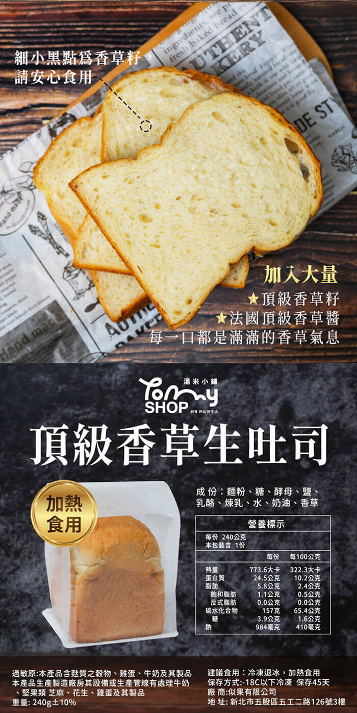 - 材質/食材:【Tommyshop】戀戀生吐司-香草生吐司(240g/入) 成分:麵粉、糖、酵母、鹽、乳酪、煉乳、水、奶油、香草 營養標示:每份熱量773.6Kacl、蛋白質24.5g、脂肪5.8g、飽和脂肪1.1g、反式脂肪0g、碳水化合物157g、糖3.9g、鈉984mg 淨量:240g±10% 保存期限:45天(係指未開封前在-18度C以下可保存天數) 保存條件:須冷凍於-18度C以下 過敏原資訊:本產品含麩質之穀物、雞蛋、牛奶及其製品,本產品生產製造廠房其設備或生產管線有處理牛奶、堅果類、芝麻、花生、雞蛋及其製品 原產地:台灣 【Tommyshop】戀戀生吐司-戀戀草莓(250g/入) 成分:麵粉、糖、水、酵母、鮮奶油、煉乳、奶油、戀戀草莓 營養標示:每份熱量771.2Kacl、蛋白質21.5g、脂肪35g、飽和脂肪9.1g、反式脂肪0g、碳水化合物136.2g、糖20.5g、鈉980mg 淨量:250g±10% 保存期限:45天(係指未開封前在-18度C以下可保存天數) 保存條件:須冷凍於-18度C以下 過敏原資訊:本產品含麩質之穀物、雞蛋、牛奶及其製品,本產品生產製造廠房其設備或生產管線有處理牛奶、堅果類、芝麻、花生、雞蛋及其製品 原產地:台灣