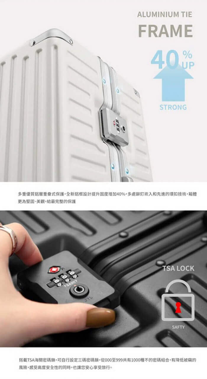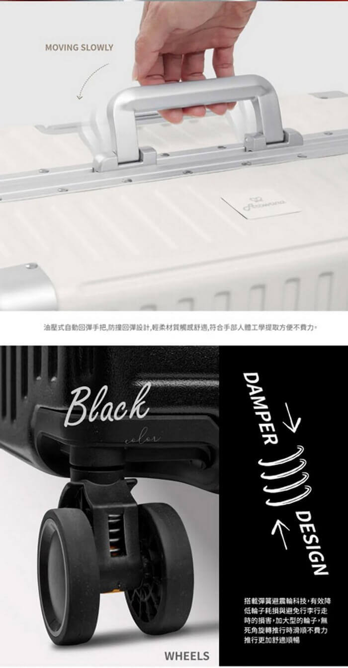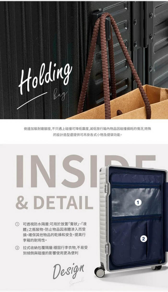 PC硬殼輕量化材質,箱身強韌耐刮耐摔,使用輕巧不費力。