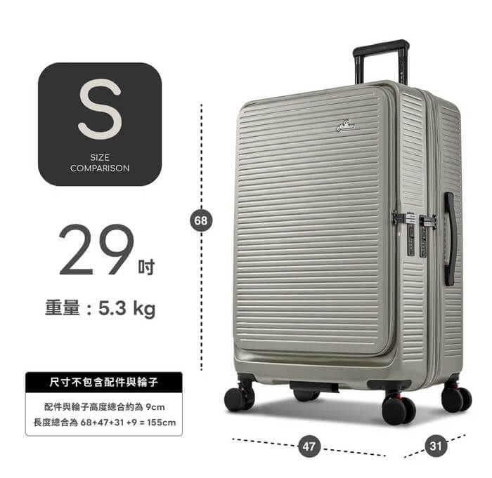 - 主商品尺寸/規格/重量/密度:尺寸:29吋-約47*31*68cm(不含輪子)/25吋-約41*28*58cm(不含輪子)