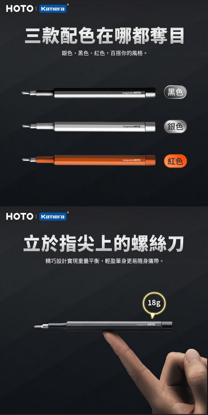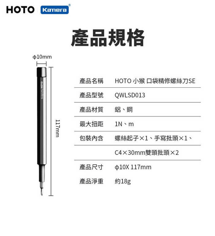 - 主商品尺寸/規格/重量/密度:產品品名:口袋精修螺絲刀 產品型號:QWLSD013 產品材質:鋁、鋼 產品顏色:紅色、銀色、黑色 最大扭距:1N、m 產品尺寸:約Φ10×117mm 包裝尺寸:約20×27×154mm 產品淨重:約18g 產品毛重:約31.1g 包裝內容:螺絲起子 ×1、手寫批頭×1、C4×30mm雙批頭×2 保固:非人為因素之損壞,台灣代理商保固90天。 備註:此賣場不含主機相關展示商品