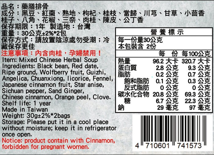- 主商品尺寸/規格/重量:【商品規格】 品名 : 藥膳排骨燉包 成分:黑豆、紅棗、熟地、枸杞、桂枝、當歸、川芎、甘草、小茴香、桂子、八角、花椒、三奈、肉桂、陳皮、公丁香 規格:30g±2%x2入/袋 保存方式:常溫勿受潮或是拆封後冷藏保存存放更安全 保存期限:未拆封一年 有效日期:標示於包裝上 有效日期說明:180天~365天,以消費者收受日起算,至少距有效日期前180日以上 製造日期:標於包裝上 製造地 : 台灣 國際條碼 : 4710601741573 【簡易調理方式】 1.排骨川燙備用。 2.取2500~3000cc的水加入燉包和排骨,再加入一些些的米酒去腥味和鹽調味,煮40分鐘即可上菜。 【注意事項】 ※孕婦、生理期、感冒者禁食用