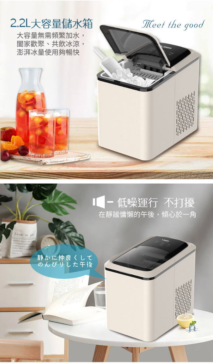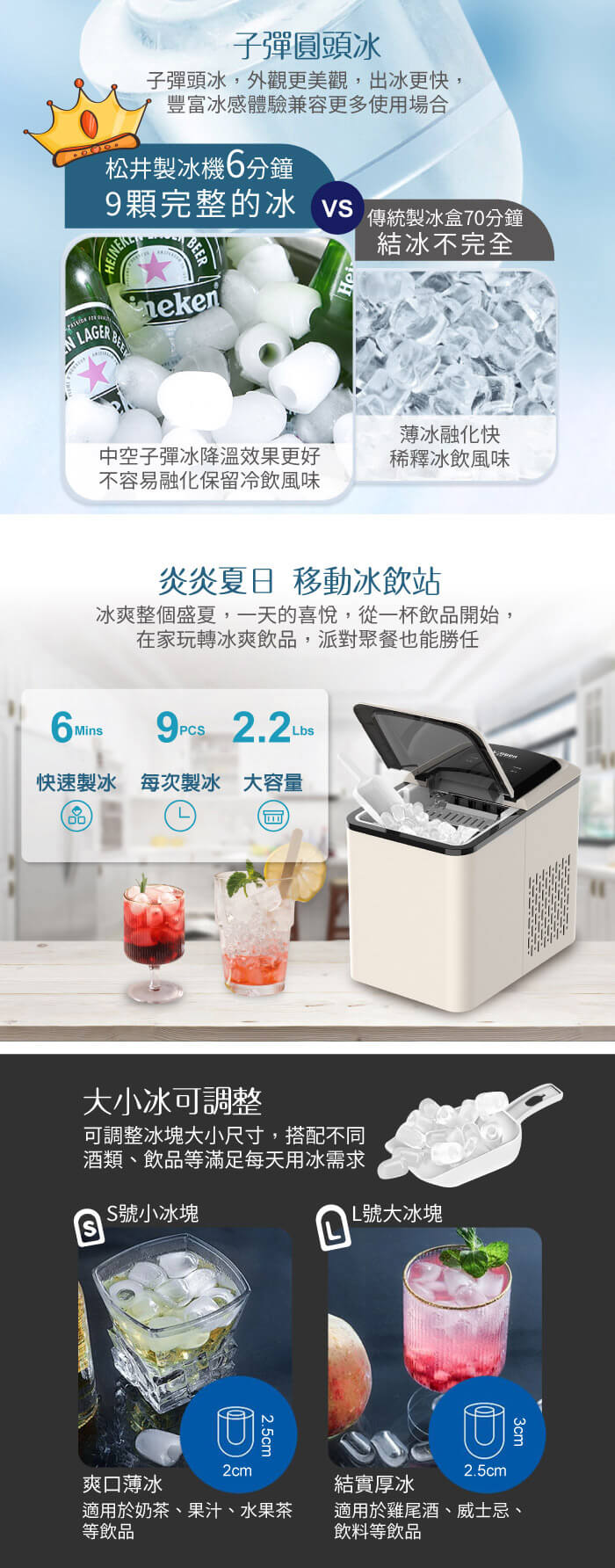 - 主商品尺寸/規格/重量:品 牌:SONGEN松井 型 號:SG-IC07E 皓月白 額定電壓及額定頻率:110V/60Hz 總額定消耗電功率:80W 商品尺寸(寬x深x高):360x240x330mm 商品重量:7.9kg 水箱容量:2.2L 冰籃容量:2.0L 冷媒種類/填充量:R600a/14g 配 件:冰籃、冰勺 單次產冰:9塊子彈冰/6~12分鐘(環境溫度21℃) 製冰量:14kg/日(環境溫度21℃/水溫15℃) 產品保證:明台產物保險2000萬產品責任險 製造沿革:45年電器專業製造,保證售後服務