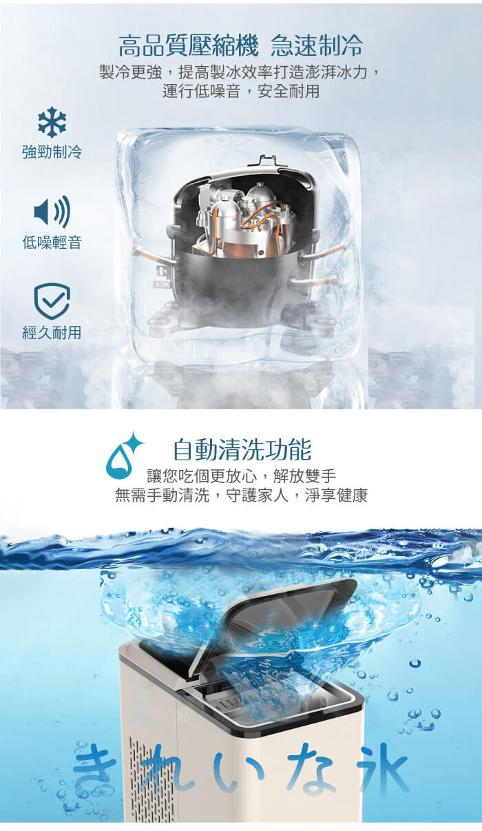 可調整衛生冰塊大小,自動清潔功能,洗淨抗菌。