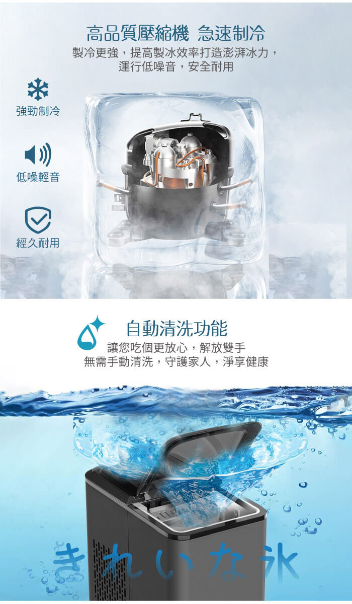 可調整衛生冰塊大小,自動清潔功能,洗淨抗菌。