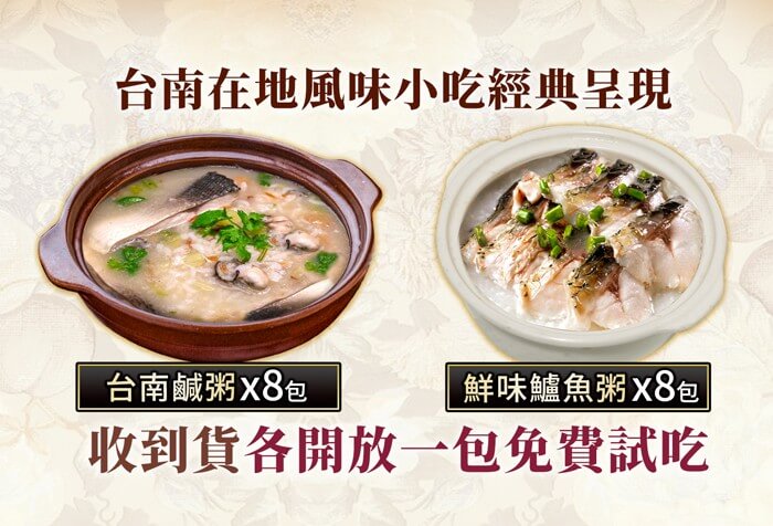 - 贈品:(1)台南鹹粥(200公克/包)*1包 (2)鮮味鱸魚粥(200公克/包)*1包