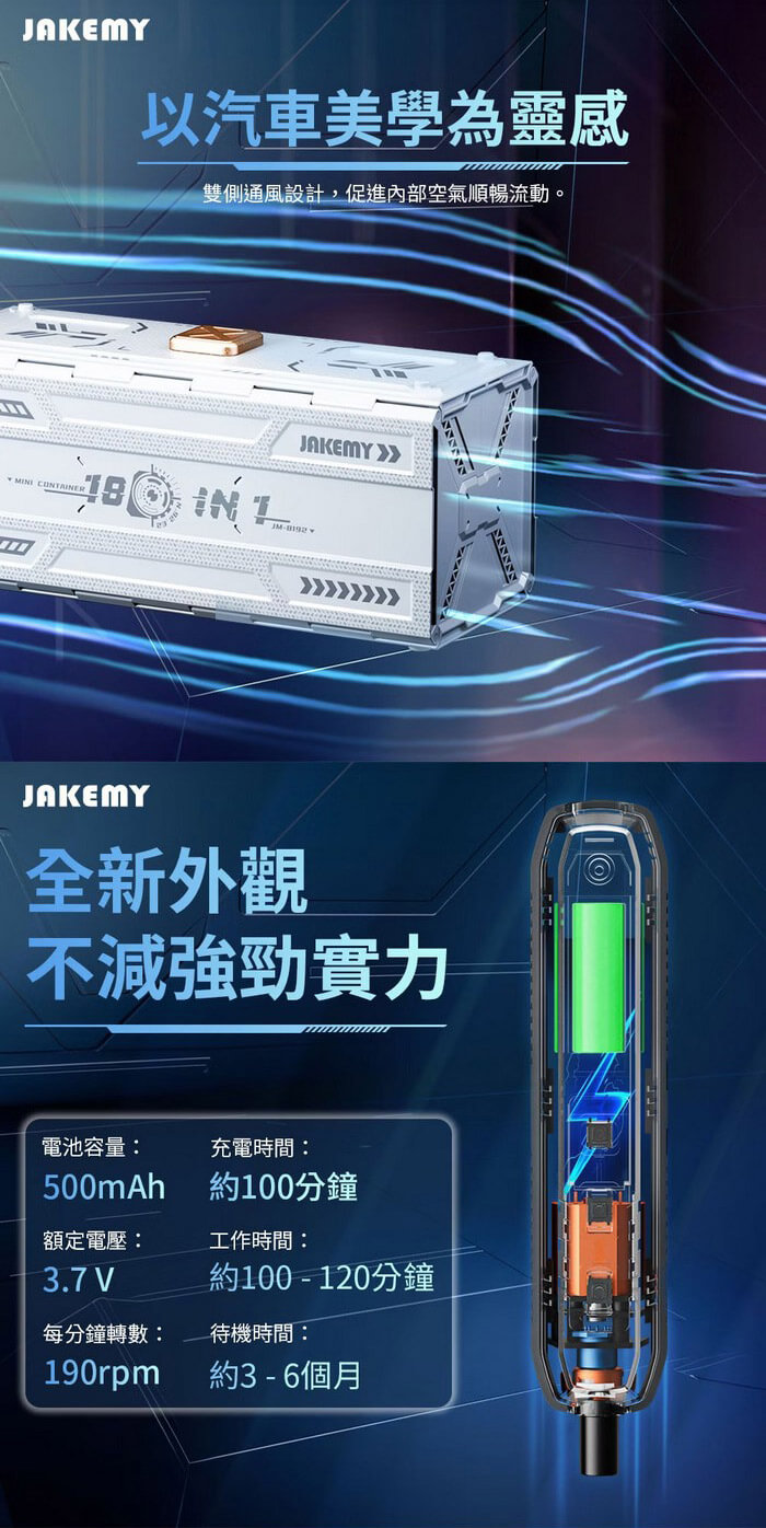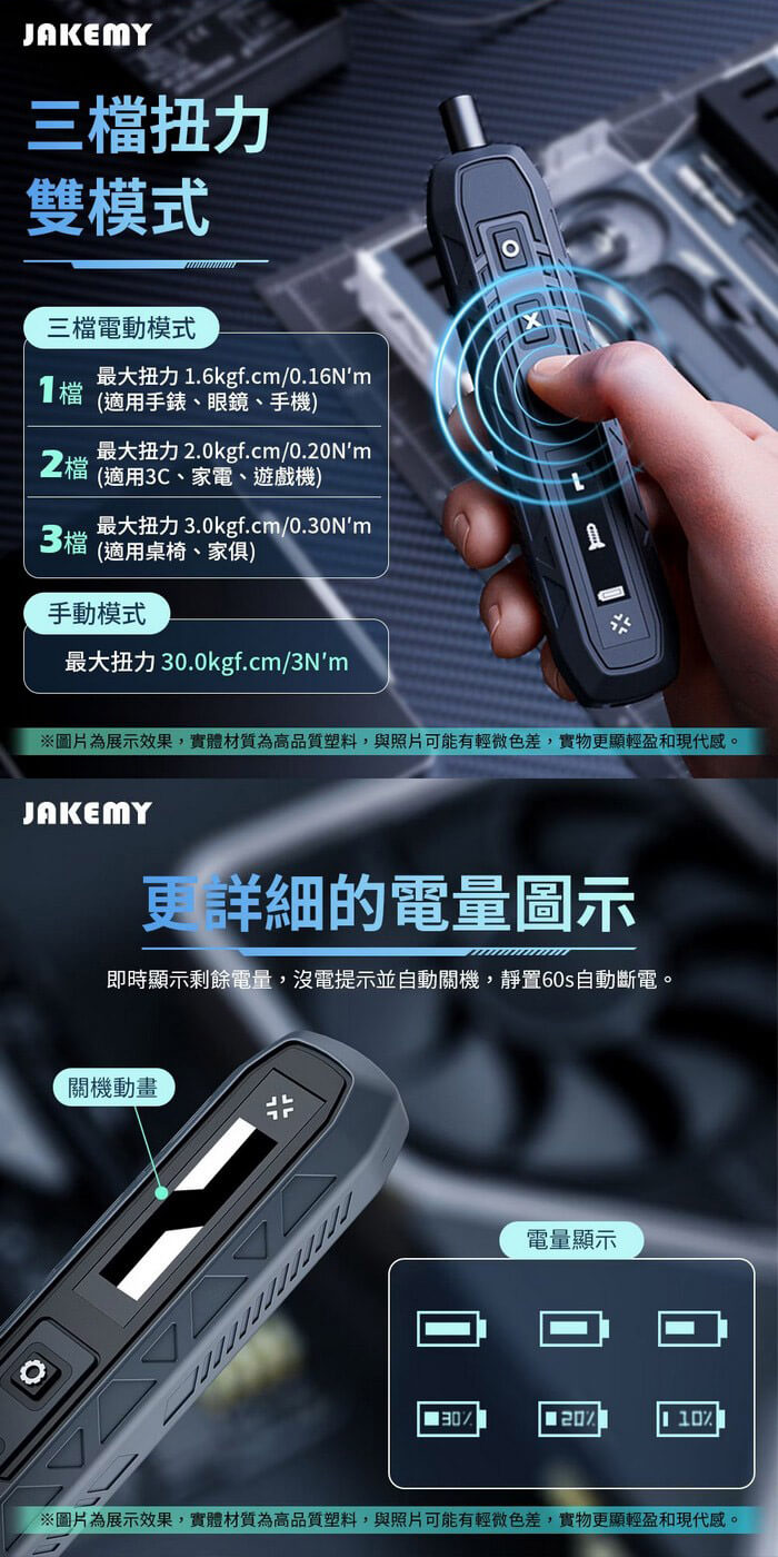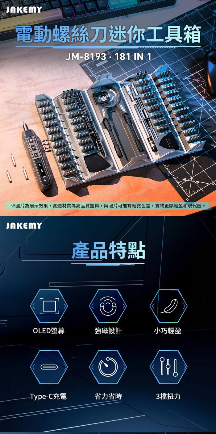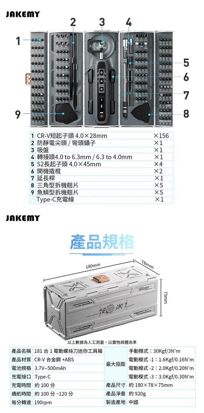 - 主商品尺寸/規格/重量/密度:產品品名:181合1 電動螺絲刀迷你工具箱 產品型號:JM-8193 產品材質:CR-V合金鋼+ABS 電池規格:3.7V⎓500mAh 充電接口:Type-C 充電時間:約100分 續航時間:約100~120分 最大扭距:電動模式-1: 1.6Kgf/0.16N'm 2: 2.0Kgf/0.20N'm 3: 3.0Kgf/0.30N'm 手動模式-30Kgf/ 3N'm 每分鐘轉速:190rpm 產品尺寸:約180×78×75mm 包裝尺寸:約208×85×80mm 產品淨重:約920g 產品毛重:約1009g 包裝內容:魚鱗型拆機翹片×5、三角型拆機翹片×5、充電線×1 鋁合金手柄×1、吸盤×1、防靜電尖頭鑷子×1 防靜電彎頭鑷子×1、開機撬棍×2、延長桿×1 螺絲起子頭-CR-V H4*28mm×144 螺絲起子頭-S-2 H4×45mm×4 螺絲起子頭-SOCKET×14 製造產地:中國 保固:非人為因素之損壞,台灣代理商保固180天。 備註:此賣場不含主機相關展示商品