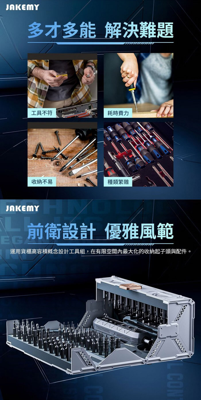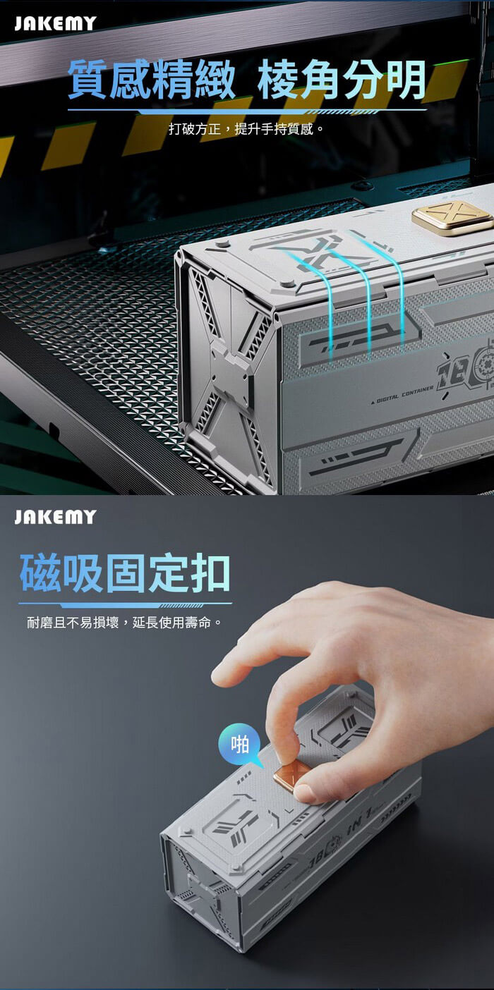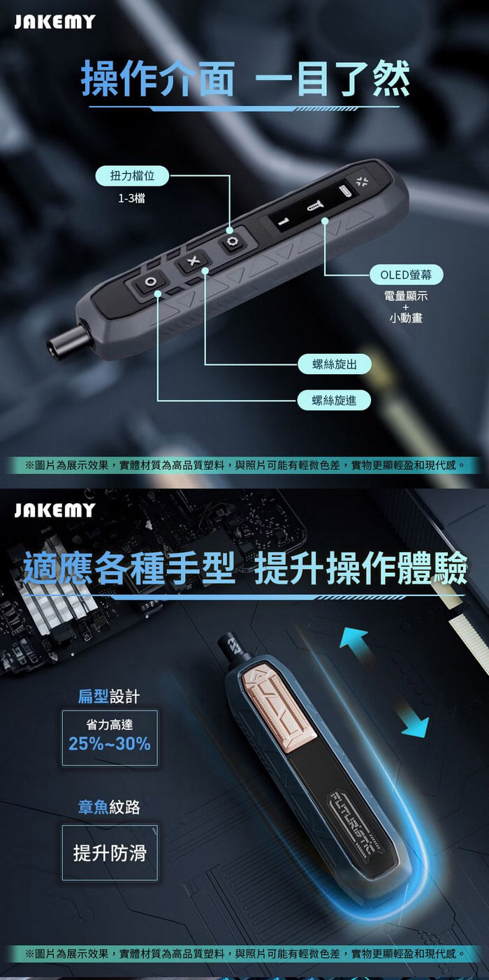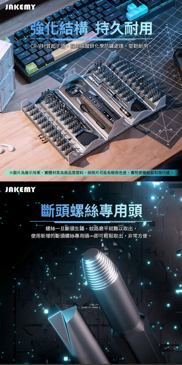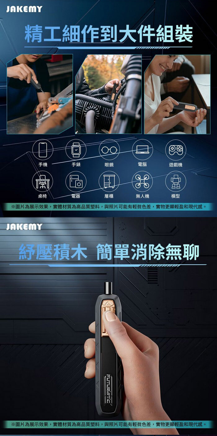 - 主商品尺寸/規格/重量/密度:產品品名:181合1 電動螺絲刀迷你工具箱 產品型號:JM-8193 產品材質:CR-V合金鋼+ABS 電池規格:3.7V⎓500mAh 充電接口:Type-C 充電時間:約100分 續航時間:約100~120分 最大扭距:電動模式-1: 1.6Kgf/0.16N'm 2: 2.0Kgf/0.20N'm 3: 3.0Kgf/0.30N'm 手動模式-30Kgf/ 3N'm 每分鐘轉速:190rpm 產品尺寸:約180×78×75mm 包裝尺寸:約208×85×80mm 產品淨重:約920g 產品毛重:約1009g 包裝內容:魚鱗型拆機翹片×5、三角型拆機翹片×5、充電線×1 鋁合金手柄×1、吸盤×1、防靜電尖頭鑷子×1 防靜電彎頭鑷子×1、開機撬棍×2、延長桿×1 螺絲起子頭-CR-V H4*28mm×144 螺絲起子頭-S-2 H4×45mm×4 螺絲起子頭-SOCKET×14 製造產地:中國 保固:非人為因素之損壞,台灣代理商保固180天。 備註:此賣場不含主機相關展示商品
