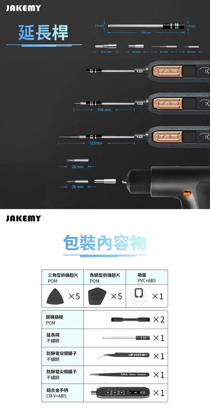 - 主商品:魚鱗型拆機翹片×5、三角型拆機翹片×5、充電線×1、鋁合金手柄×1、吸盤×1、防靜電尖頭鑷子×1、防靜電彎頭鑷子×1、開機撬棍×2、延長桿×1、螺絲起子頭-CR-V H4*28mm×144、螺絲起子頭-S-2 H4×45mm×4、螺絲起子頭-SOCKET×14