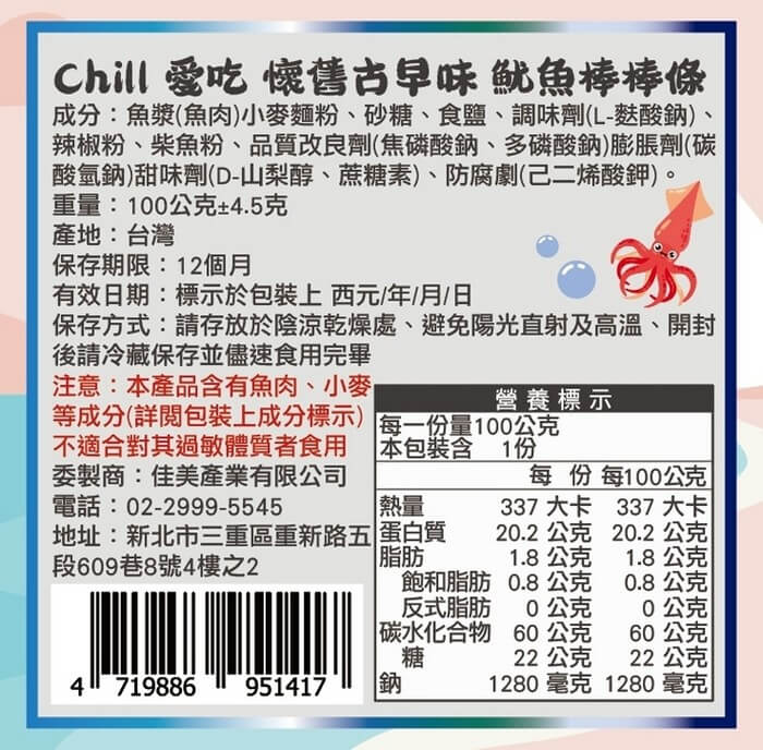 - 主商品尺寸/規格/重量:【產品規格】 品名 : 魷魚棒棒條 成份:魚漿(魚肉) 、小麥麵粉、砂糖、食鹽、調味劑(L-麩酸鈉)、辣椒粉、柴魚粉、品質改良劑(焦磷酸鈉、多磷酸鈉) 、膨脹劑(碳酸氫鈉) 、甜味劑(D-山梨醇、蔗糖素)、防腐劇(己二烯酸鉀) 食品添加物:調味劑(L-麩酸鈉) 、品質改良劑(焦磷酸鈉、多磷酸鈉) 膨脹劑(碳酸氫鈉) 、甜味劑(D-山梨醇、蔗糖素)、防腐劇(己二烯酸鉀) 規格:100g±4.5%/包 保存期限:12個月(未拆封) 有效日期:標示於包裝上 有效日期說明:180天~365天,以消費者收受日起算,至少距有效日期前180日以上 保存方式:為確保產品品質,請存放於陰涼乾燥處,避免陽光直射,拆封後請盡快食用完畢 產地:台灣 國際條碼 : 4719886951417 【注意事項】 ※本產品含有魚肉、小麥等成份(詳閱包裝上成份標示),不適合對其過敏體質者食用