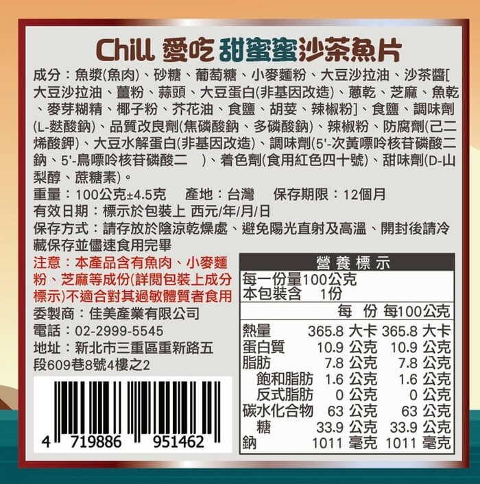 - 主商品尺寸/規格/重量:【產品規格】 品名 : 甜蜜沙茶魚片 成份:魚漿(魚肉)、砂糖、葡萄糖、小麥麵粉、大豆沙拉油、沙茶醬[大豆沙拉油、薑粉、蒜頭、大豆蛋白(非基因改造)、蔥乾、芝麻、魚乾、麥芽糊精、椰子粉、芥花油、食鹽、胡荽、辣椒粉]、食鹽、調味劑(L-麩酸鈉)、品質改良劑(焦磷酸鈉、多磷酸鈉)、辣椒粉、防腐劑(己二烯酸鉀)、大豆水解蛋白(非基因改造)、調味劑(5'-次黃嘌呤核苷磷酸二鈉、5'-鳥嘌呤核苷磷酸二纳)、着色劑(食用紅色四十號)、甜味劑(D-山梨醇、蔗糖素) 食品添加物:調味劑(L-麩酸鈉)、品質改良劑(焦磷酸鈉、多磷酸鈉)、辣椒粉、防腐劑(己二烯酸鉀)、調味劑(5'-次黃嘌呤核苷磷酸二鈉、5'-鳥嘌呤核苷磷酸二纳)、着色劑(食用紅色四十號)、甜味劑(D-山梨醇、蔗糖素) 規格:100g±4.5g/包 保存期限:12個月(未拆封) 有效日期:標示於包裝上 有效日期說明:180天~365天,以消費者收受日起算,至少距有效日期前180日以上 保存方式:請存放於陰涼乾燥處、避免陽光直射及高溫、開封後請冷藏保存並儘速食用完畢 產地:台灣 國際條碼 : 4719886951462 【責任廠商】 負責廠商 : 佳美產業有限公司 地址 : 新北市三重區重新路5段609巷10-8號1樓 電話 : 02-29995545 食品業者登錄字號 : F-183107437-00000-6 產品責任險字號 : 國泰世華產險1516 字第09PD03471號 【注意事項】 ※本產品含有魚肉、鱈魚、小麥麵粉、大豆等成份(詳閱包裝上成分標示)不適合對其過敏體質者食用
