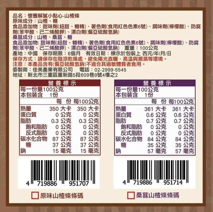 - 主商品尺寸/規格/重量:【產品規格】 品名 : 懷舊解膩小點心-山楂條 口味 : 經典原味/酸甜桑葚 ※經典原味-山楂、糖、食品添加物:甜味劑(紐甜、糖精)、著色劑(食用紅色色素6號)、調味劑(檸檬酸)、防腐劑(苯甲酸、己二烯酸鉀)、漂白劑(偏亞硫酸氫鈉) ※酸甜桑葚-山楂、桑葚、糖、甜味劑(紐甜、糖精)、著色劑(食用紅色色素6號)、調味劑(檸檬酸)、防腐劑(苯甲酸、己二烯酸鉀)、漂白劑(偏亞硫酸氫鈉) 食品添加物:甜味劑(紐甜、糖精)、著色劑(食用紅色色素6號)、調味劑(檸檬酸)、防腐劑(苯甲酸、己二烯酸鉀)、漂白劑(偏亞硫酸氫鈉) 規格:100g/包 保存期限:6個月(未拆封) 有效日期:標示於包裝上 有效日期說明:60天~180天,以消費者收受日起算,至少距有效日期前60日以上 保存方式:請放置在陰涼處勿受潮或陽光直射!開封後請儘速食用完畢! 產地:中國 國際條碼 : 經典原味- 4719886951707 / 酸甜桑葚- 4719886951714 【注意事項】 ※本產品含有(偏亞硫酸氫鈉)不適合其過敏體質者食用