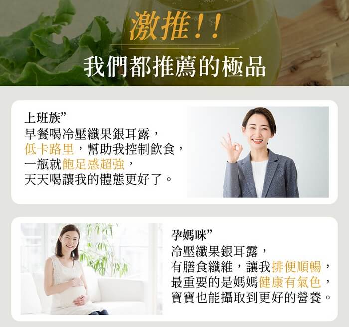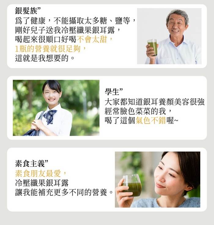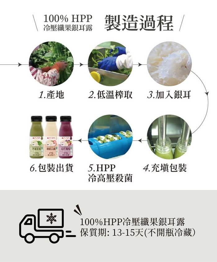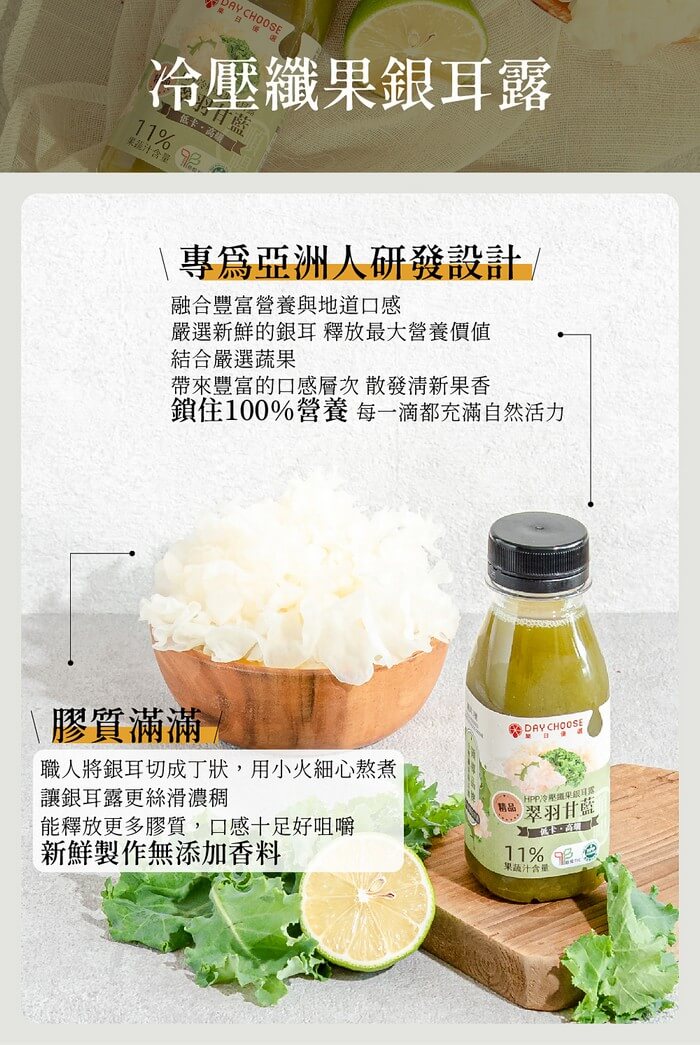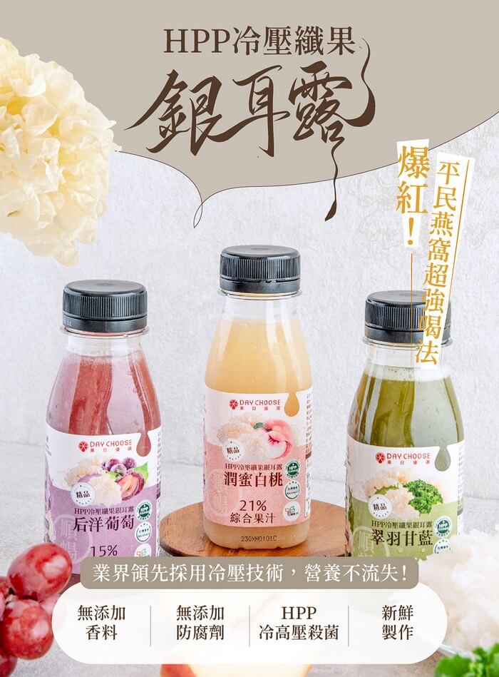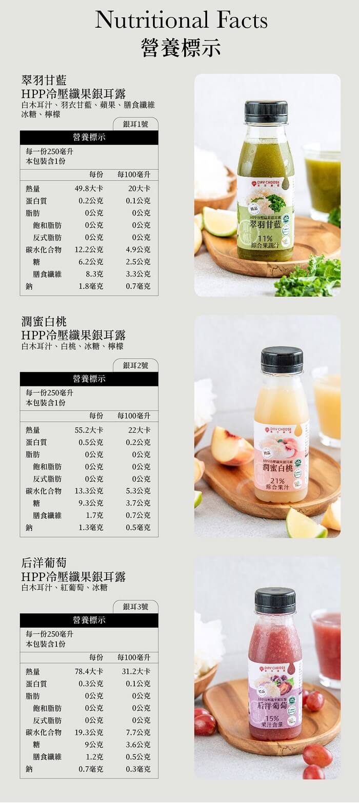 - 材質/食材:(1) 銀耳1號-翠羽甘藍冷壓纖果銀耳露 成分:白木耳、羽衣甘藍、蘋果、膳食纖維、冰糖、檸檬 (2) 銀耳2號-潤蜜白桃冷壓纖果銀耳露 成份:木耳、白桃、冰糖、檸檬 (3) 銀耳3號-后洋葡萄冷壓纖果銀耳露 成份:白木耳、紅葡萄、冰糖