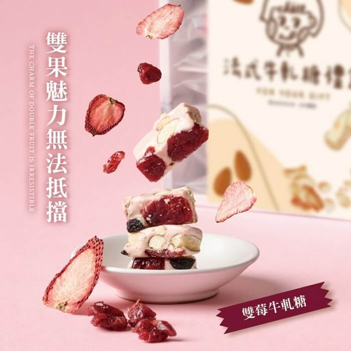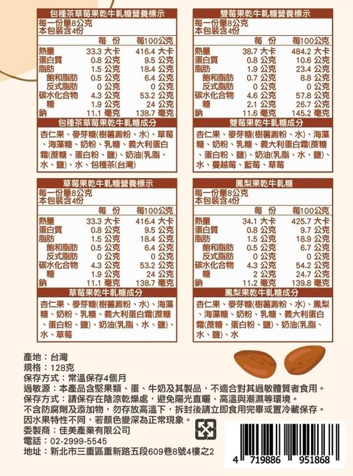 - 材質/食材:成份: ※包種茶草莓果乾牛軋糖: 杏仁果、麥芽糖(樹薯澱粉、水)、海藻糖、奶粉、乳糖、義大利蛋白霜(蔗糖、蛋白粉、鹽)、奶油(乳脂、水、鹽)、水、草莓、包種茶(台灣) ※雙莓果乾牛軋糖: 杏仁果、麥芽糖(樹薯澱粉、水)、海藻糖、奶粉(100%鮮乳)、乳糖、義大利蛋白霜(蔗糖、蛋白粉、鹽)、奶油(乳脂、水、鹽)、水、蔓越莓(蔓越莓、蔗糖、葵花籽油)、藍莓(藍莓、蔗糖、葵花籽油)、草莓 ※草莓果乾牛軋糖: 杏仁果、麥芽糖(樹薯澱粉、水)、海藻糖、奶粉、乳糖、義大利蛋白霜(蔗糖、蛋白粉、鹽)、奶油(乳脂、水、鹽)、水、草莓 ※鳳梨果乾牛軋糖: 杏仁果、麥芽糖(樹薯澱粉、水)、鳳梨、海藻糖、奶粉、乳糖、義大利蛋白霜(蔗糖、蛋白粉、鹽)、奶油(乳脂、水、鹽)、水
