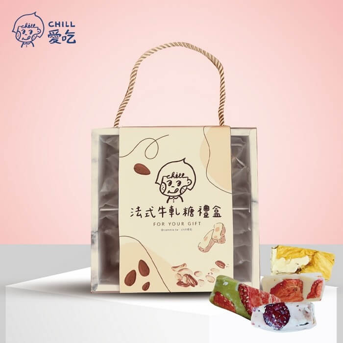 - 主商品:【CHILL愛吃】法式手工果乾綜合口味牛軋糖禮盒 (128g/盒)x1盒