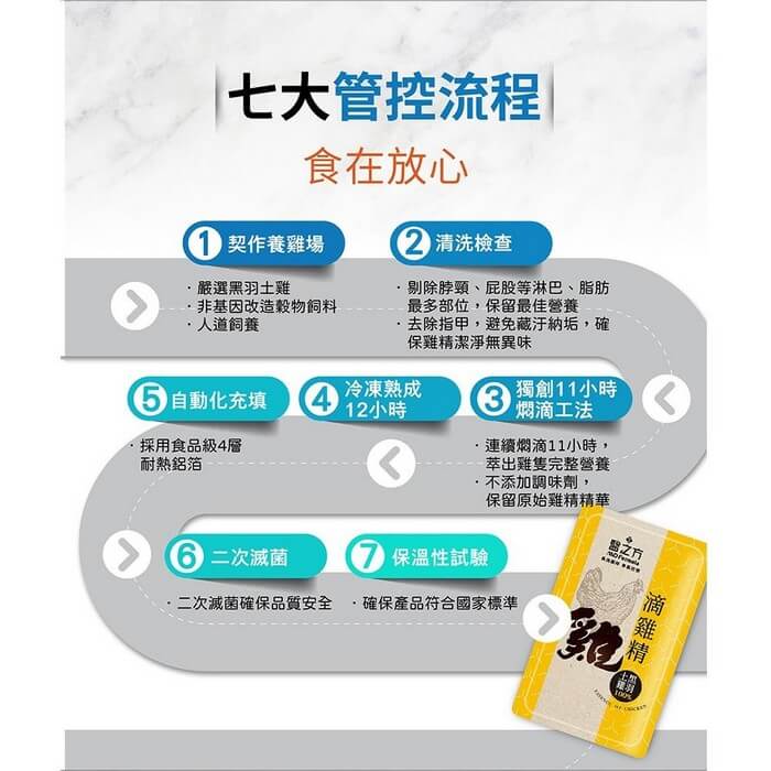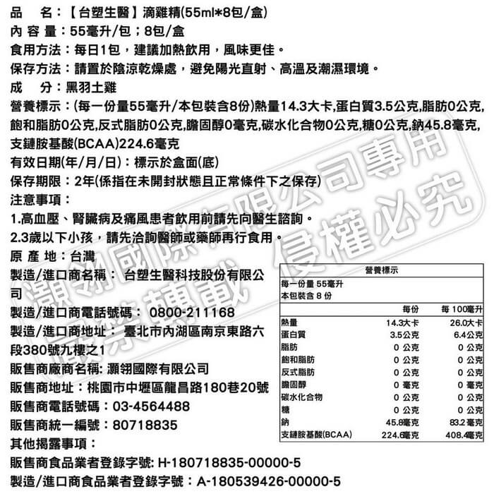 - 主商品尺寸/規格/重量:品 名:【台塑生醫】滴雞精(55ml*8包/盒) 內 容 量:55毫升/包;8包/盒 保存方法:請置於陰涼乾燥處,避免陽光直射、高溫及潮濕環境。 營養標示:(每一份量55毫升/本包裝含8份)熱量14.3大卡,蛋白質3.5公克,脂肪0公克,飽和脂肪0公克,反式脂肪0公克,膽固醇0毫克,碳水化合物0公克,糖0公克,鈉45.8毫克,支鏈胺基酸(BCAA)224.6毫克 有效日期(年/月/日):標示於盒面(底) 保存期限:2年(係指在未開封狀態且正常條件下之保存) 注意事項: 1.高血壓、腎臟病及痛風患者飲用前請先向醫生諮詢。 2.3歲以下小孩,請先洽詢醫師或藥師再行食用。 原 產 地:台灣 製造/進口商名稱: 台塑生醫科技股份有限公司 製造/進口商電話號碼: 0800-211168 製造/進口商地址: 臺北市內湖區南京東路六段380號九樓之1 販售商廠商名稱: 灝翎國際有限公司 販售商地址:桃園市中壢區龍昌路180巷20號 販售商電話號碼:03-4564488 販售商統一編號:80718835 其他揭露事項: 販售商食品業者登錄字號: H-180718835-00000-5 製造/進口商食品業者登錄字號:A-180539426-00000-5