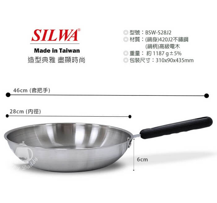 - 主商品尺寸/規格/重量/密度: 型號:BSW-S28J2 ◎ 產品尺寸:(內徑)28cm/(含把手)46cm /(高)6cm ◎ 材質:(鍋身)420J2不鏽鋼 / (鍋柄)高級電木 ◎ 重量: 約 1187 g±5% (含蓋) ◎ 包裝尺寸:310x90x435mm ◎ 產地 : 台灣