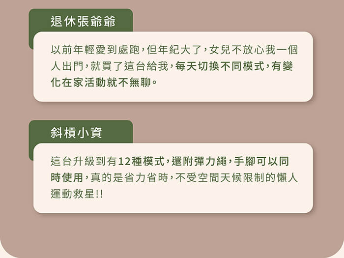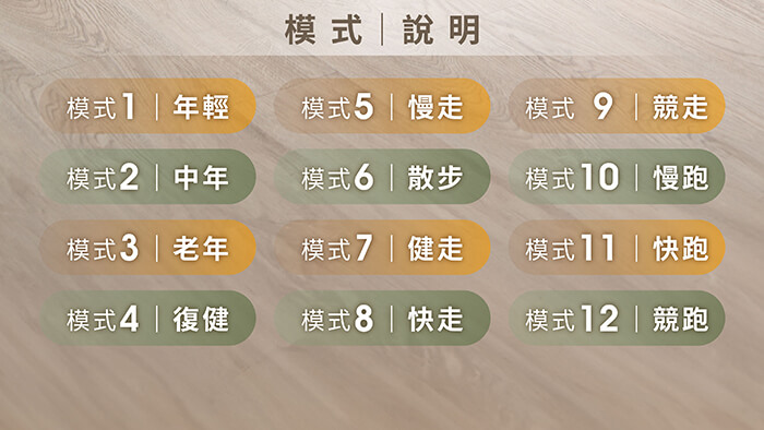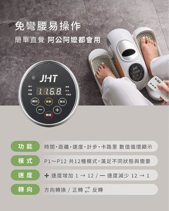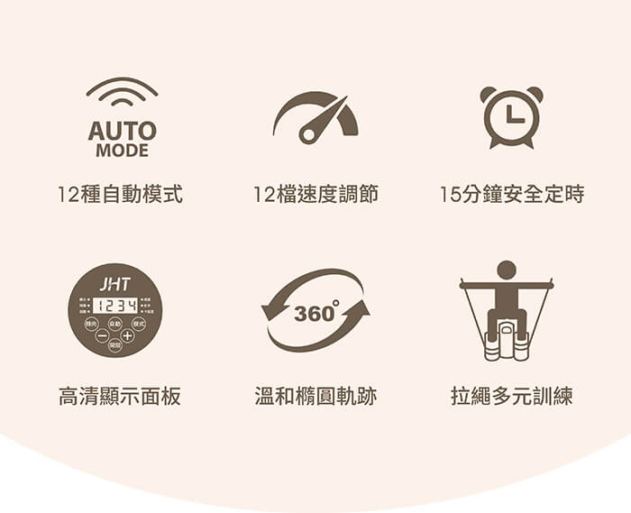12種自動程序,12段速度調整,15分鐘安全模式。