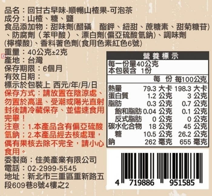 - 主商品尺寸/規格/重量:【產品規格】 品名 : 回甘古早味-順暢山楂果 成份:山楂、糖、鹽、甜味劑(醋磺内酯鉀、紐甜、蔗糖素、甜菊糖苷)、防腐劑(苯甲酸)、漂白劑(偏亞硫酸氫鈉)、調味劑(檸檬酸)、香料著色劑(食用色素紅色6號) 食品添加物:甜味劑(醋磺内酯鉀、紐甜、蔗糖素、甜菊糖苷)、防腐劑(苯甲酸)、漂白劑(偏亞硫酸氫鈉)、調味劑(檸檬酸)、香料著色劑(食用色素紅色6號) 規格:40g±2g/包 保存期限:6個月 有效日期:標示於包裝上 有效日期說明 : 60天~180天,以消費者收受日起算,至少距有效日期前60日以上 保存方式:請放置在陰涼處、勿置於高溫、受潮或陽光直射之場所!開封後請冷藏保存、並儘速食用完畢! 產地 : 台灣 國際條碼 : 4719886951585 【注意事項】 ※本產品經去核處理,偶有果核去除不完全,請小心食用。 ※本產品含有偏亞硫酸氫鈉,不適合其過敏體質者食用