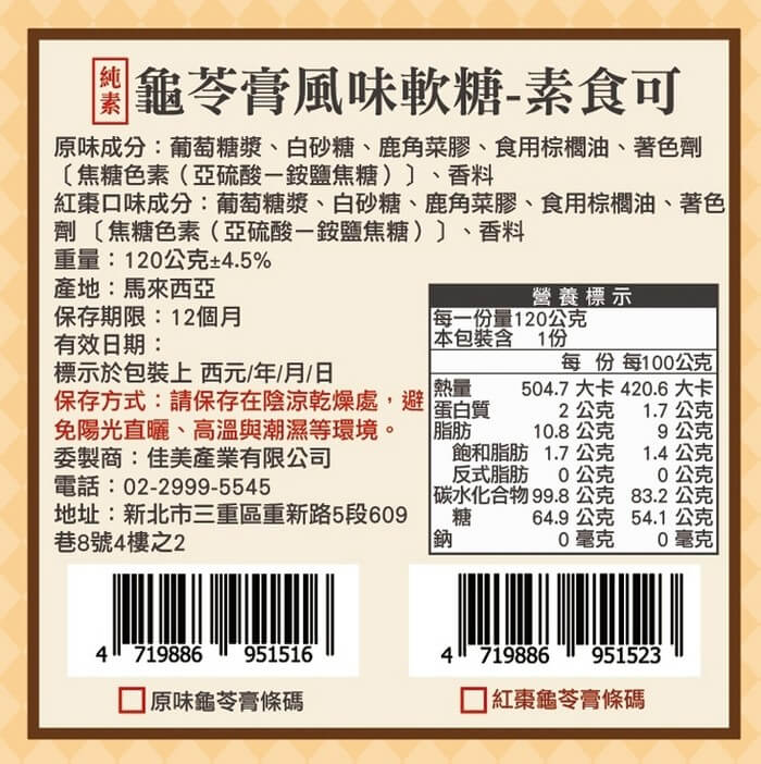 - 主商品尺寸/規格/重量:品名 : 龜苓膏風味軟糖 成份: ※原味-葡萄糖漿、白砂糖、鹿角菜膠、食用棕櫚油、著色劑 〔焦糖色素(亞硫酸-銨鹽焦糖)〕、香料 ※紅棗-葡萄糖漿、白砂糖、鹿角菜膠、食用棕櫚油、紅棗、著色劑 〔焦糖色素(亞硫酸-銨鹽焦糖)〕、香料 食品添加物:著色劑 〔焦糖色素(亞硫酸-銨鹽焦糖)〕、香料 規格:120g±4.5g/包 保存期限:12個月 有效日期:標示於包裝上 有效日期說明:120天~365天,以消費者收受日起算,至少距有效日期前120日以上 保存方式:請置陰涼處避免陽光直射;開封後請冷藏保存 產地:馬來西亞 國際條碼 : 原味: 4719886951516 / 紅棗: 4719886951523