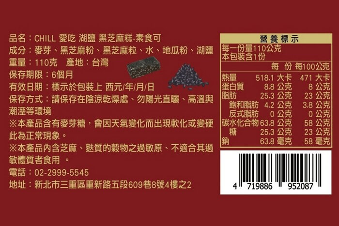 - 主商品:【CHILL愛吃】湖鹽黑芝麻糕(全素-110g/包)x3包
