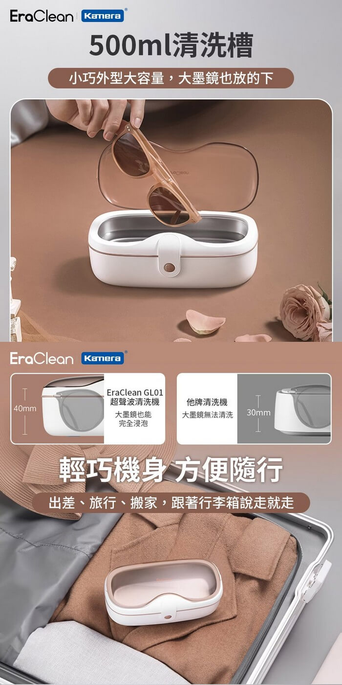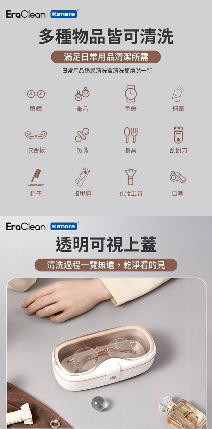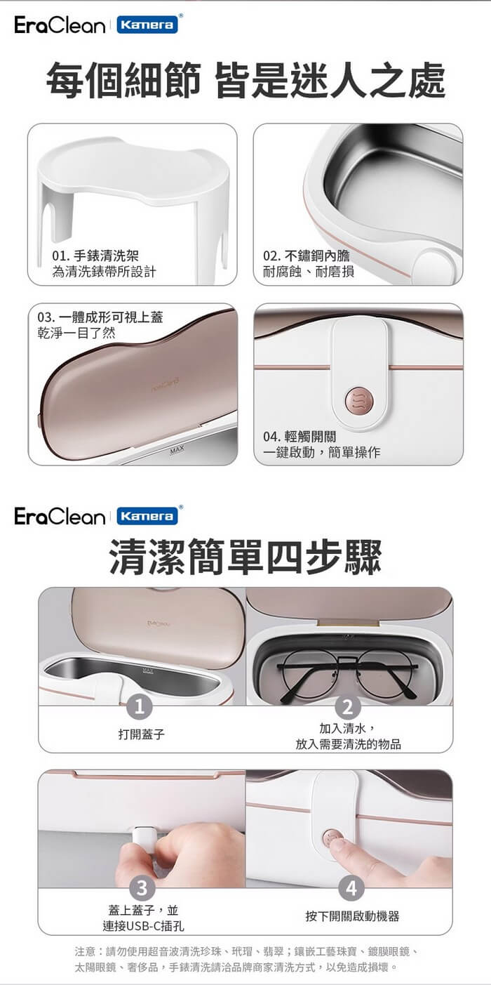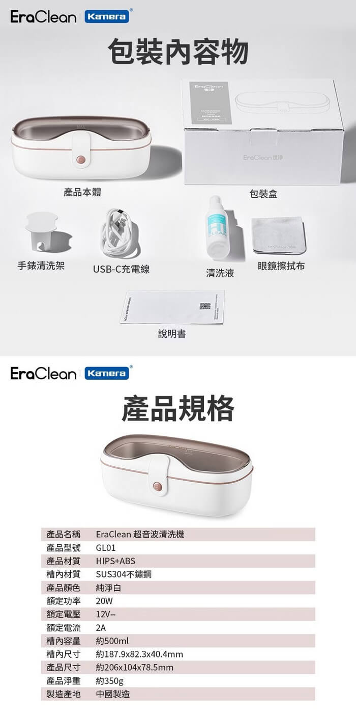 - 主商品尺寸/規格/重量:品名:超音波清洗機 型號:GL01 產品材質:HIPS+ABS 清洗槽材質:SUS304不鏽鋼 產品顏色:純淨白 額定功率:20W 額定電壓:12V⎓ 額定電流:2A 超音波頻率:41000Hz 清洗槽容量:約500ml 清洗槽尺寸:約187.9x82.3x40.4mm 產品尺寸:約206x104x78.5mm 包裝尺寸:約238x181x103mm 產品淨重:約350g 產品毛重:約656g 包裝內容:產品本體x1、USB-C充電線x1、說明書x1、手錶清洗架x1、清洗液x1、眼鏡擦拭布x1、包裝盒x1 保固:非人為因素之損壞,台灣代理商保固180天。 備註:此賣場不含主機相關展示商品