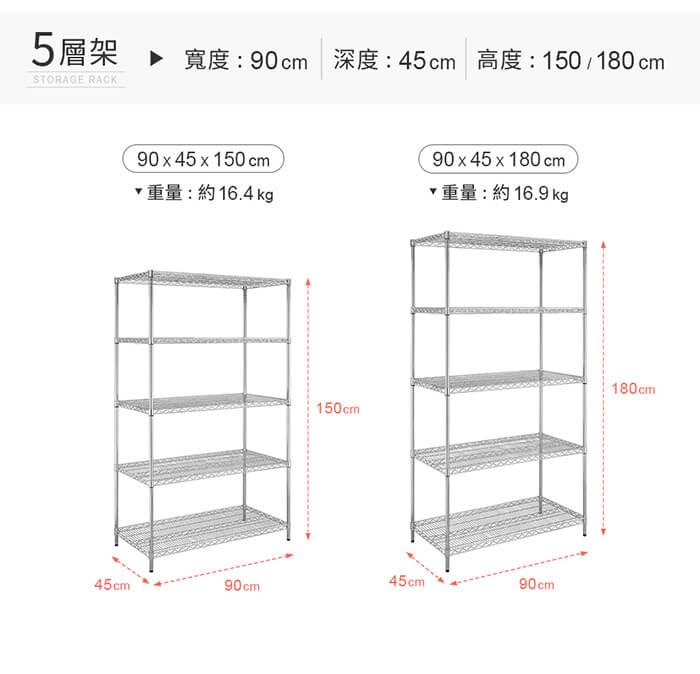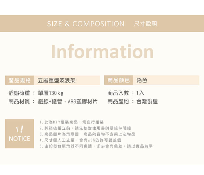 - 主商品尺寸/規格/重量/密度:內容件數:重型五層電鍍波浪架x1,共1入/組 顏色:電鍍鉻色 材質:鐵管+網片 層數:五層 尺寸:寬120cm x 深45cm x 高150cm 每層高度:依個人收納空間,可任意調整 靜態荷重:單層130KG 內含:鐵管+網片、ABS塑膠材片 重量:19.8KG ±5% (不含包裝) 產地:100%台灣製造