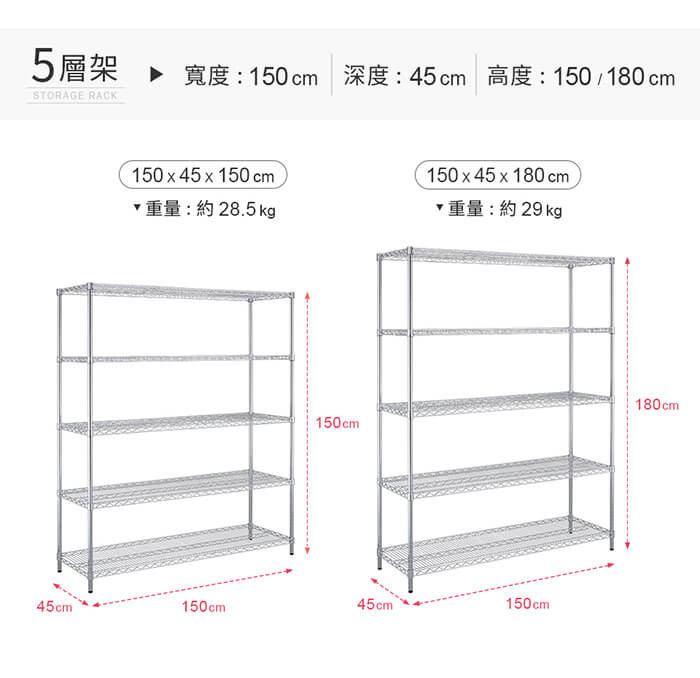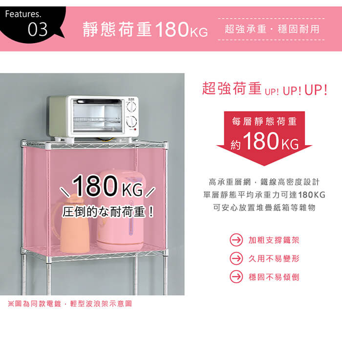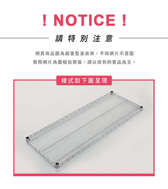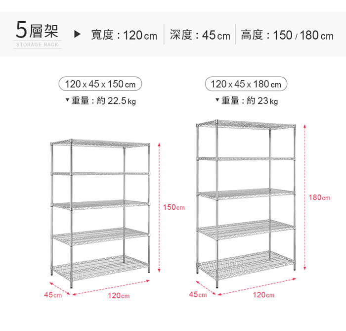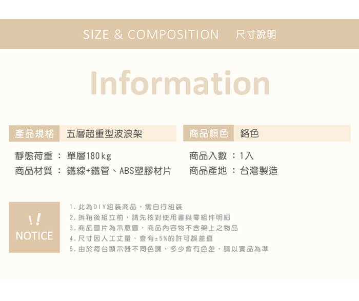 - 主商品尺寸/規格/重量/密度:內容件數:超重型五層電鍍波浪架x1,共1入/組 顏色:電鍍鉻色 材質:鐵管+網片 層數:五層 尺寸:寬120cm x 深45cm x 高180cm 每層高度:依個人收納空間,可任意調整 靜態荷重:單層180KG 內含:鐵管+網片、ABS塑膠材片 重量:23KG ±5% (不含包裝) 產地:100%台灣製造