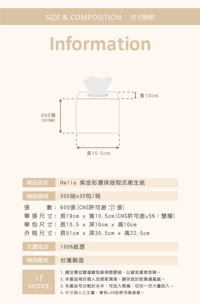 - 主商品尺寸/規格/重量/密度:內容件數:紫金彩環保抽取式衛生紙 x 30包,共1箱 張數:600張(CNS許可差 +36 -21 張) 單張尺寸:寬105mm x 長190mm (CNS許可差 ±5% ,雙層) 外箱尺寸:長51cm x 寬30.5cm x 高22.5cm 主要成分:100%紙漿 重量:5.48KG ±5% (含紙箱) 產地:100%台灣製造 ⚠ 請注意幼童遠離包裝用塑膠袋,以避免窒息危險。 ⚠ 本產品用於個人及居家清潔,請存放於乾燥通風處。 ⚠ 本產品可分散於水中,可丟入馬桶,切勿一次大量投入。