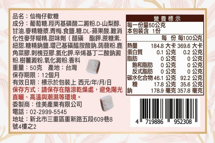 - 主商品尺寸/規格/重量:【產品規格】 品名 : 仙梅仔軟糖 成份:葡萄糖.羥丙基磷酸二澱粉.D-山梨醇.甘油.麥精糖漿.青梅.食鹽.糖.DL-蘋果酸.難消化性麥芽糊精.甜味劑(醋磺内酯鉀.蔗糖素.紐甜.糖精鈉鹽.環己基磺醯胺酸鈉).蒟蒻粉.鹿角菜膠.刺槐豆膠.氯化鉀.辛烯基丁二酸鈉澱粉.樹薯澱粉.氧化澱粉.香料 食品添加物:甜味劑(醋磺内酯鉀.蔗糖素.紐甜.糖精鈉鹽.環己基磺醯胺酸鈉).蒟蒻粉.鹿角菜膠.刺槐豆膠.氯化鉀.辛烯基丁二酸鈉澱粉.樹薯澱粉.氧化澱粉.香料 規格:50g/包 保存期限:12個月 有效日期:標示於包裝上 有效日期說明:120天~365天,以消費者收受日起算,至少距有效日期前120日以上 保存方式:請保存於陰涼乾燥處,避免陽光直射、高溫與潮溼環境 產地:台灣 國際條碼 : 471988695230
