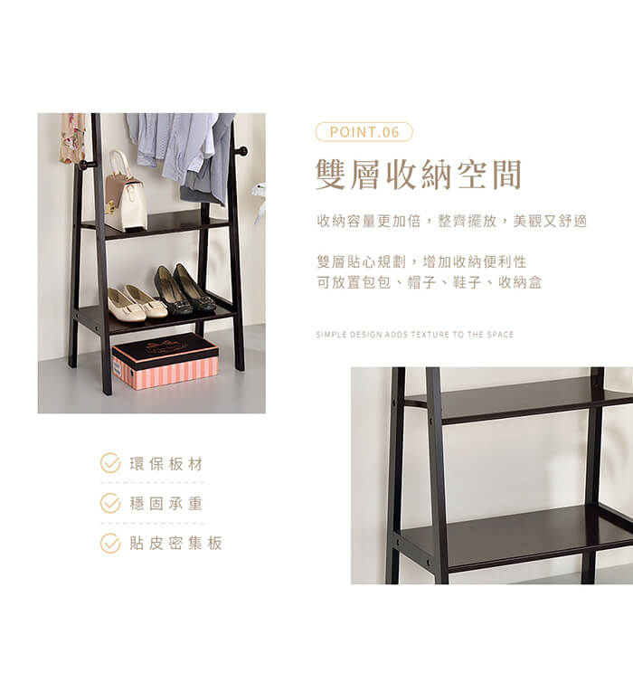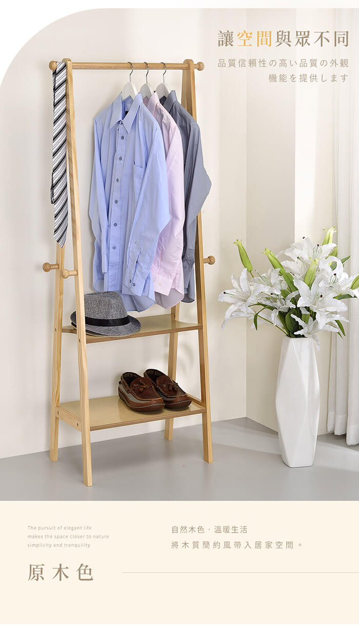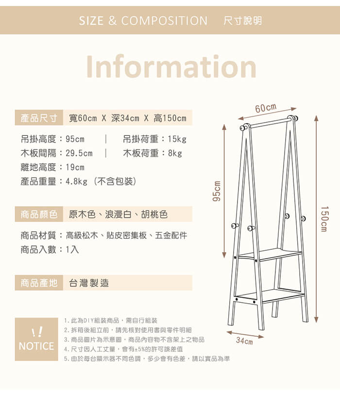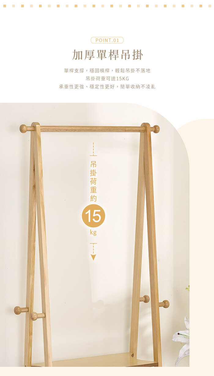 - 主商品尺寸/規格/重量/密度:內容件數:松木A字單桿雙層吊衣架x1,共1入/組 顏色:原木色 / 浪漫白 / 胡桃色 材質:實木 尺寸:寬60cm x 深34cm x 高150cm 吊掛高度:95cm 吊掛荷重:15KG 木板間隔:29.5cm 木板荷重:8KG 離地高度:19cm 內含:高級松木、貼皮密集板、五金配件 重量:4.8KG ±5% (不含包裝) 產地:100%台灣製造
