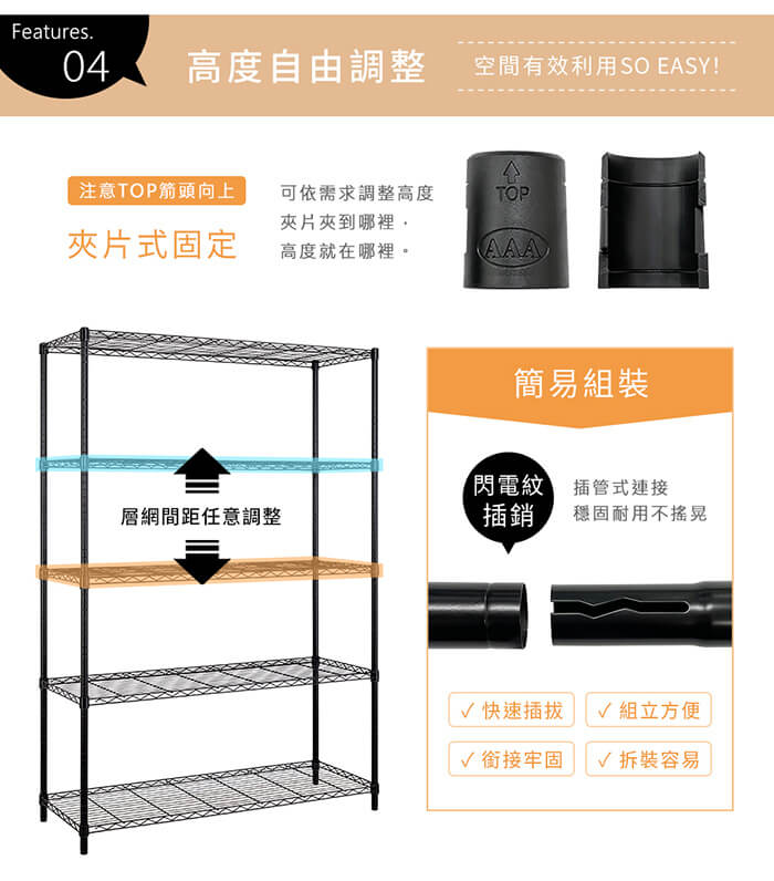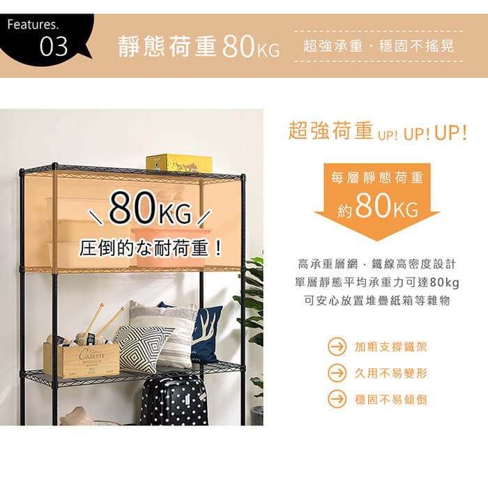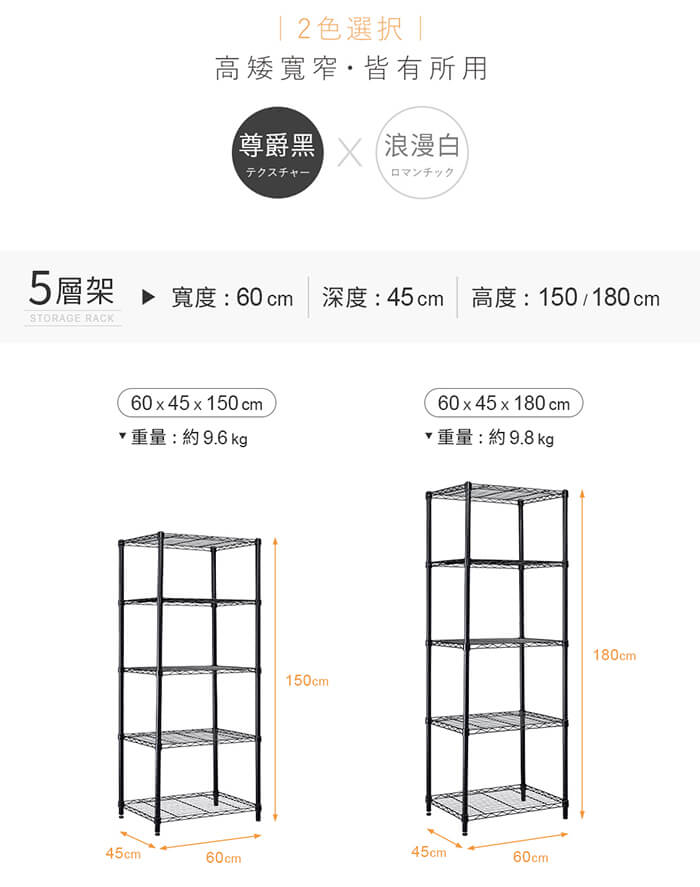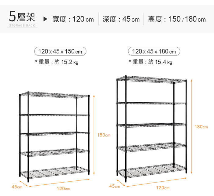 - 主商品尺寸/規格/重量/密度:內容件數:輕型五層烤漆波浪架x1,共1入/組 顏色:尊爵黑 / 浪漫白 材質:鐵管+網片 層數:五層 尺寸:寬120cm x 深45cm x 高180cm 每層高度:依個人收納空間,可任意調整 靜態荷重:單層80KG 內含:鐵管+網片、ABS塑膠材片 重量:15.4KG ±5% (不含包裝) 產地:100%台灣製造