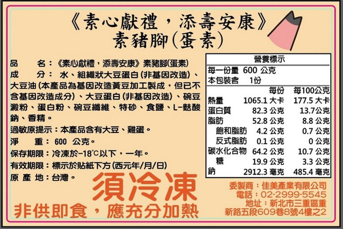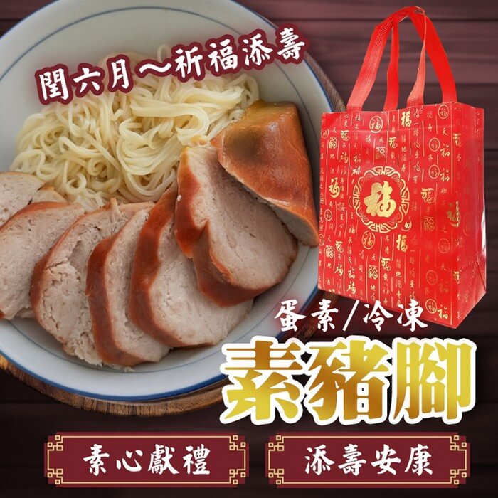 - 主商品尺寸/規格/重量:【產品規格】 品名 : 素豬腳 內容物 : 素豬腳1隻+燙金福壽提袋 成份:水、組織狀大豆蛋白(非基因改造)、大豆油(本產品為基因改造黃豆加工製成、但不含基因改造成分) 、大豆蛋白(非基因改造) 、碗豆澱粉、蛋白粉、碗豆纖維、特砂、食鹽、L-麩酸鈉、香精 規格:600g 保存期限:一年 有效日期:標示於包裝上(西元 年/月/日) 有效日期說明: 120天~365天,以消費者收受日起算,至少距有效日期前120日以上 保存方式:冷凍-18度c以下 產地:台灣 國際條碼 : 4719886952742 【料理方式建議】 ※加熱切片搭配麵線 將冷凍素豬腳放入電鍋蒸煮/微波/氣炸覆熱後,即可切片,擺盤後搭配煮好的白麵線即可享用 ※麻油湯佐素豬腳 麻油入鍋,小火炒香薑片後,加入適量水煮沸,放入素豬腳,續煮10分鐘至湯頭香醇 【注意事項】 ※過敏原訊息:本產品含有大豆、雞蛋,不適合對其過敏體質者食用 ※本產品非供即食,應充分加熱後食用