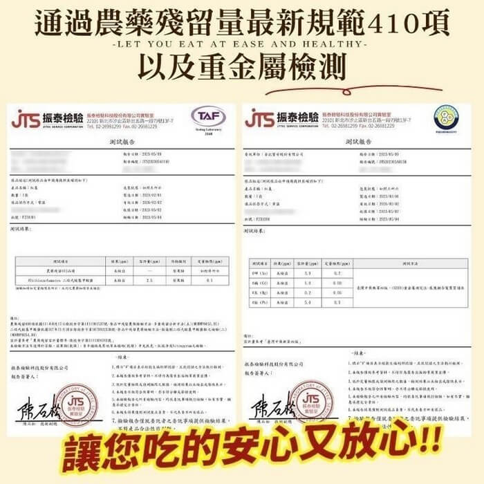 通過農藥殘留量最新規範410項及重金屬檢測。