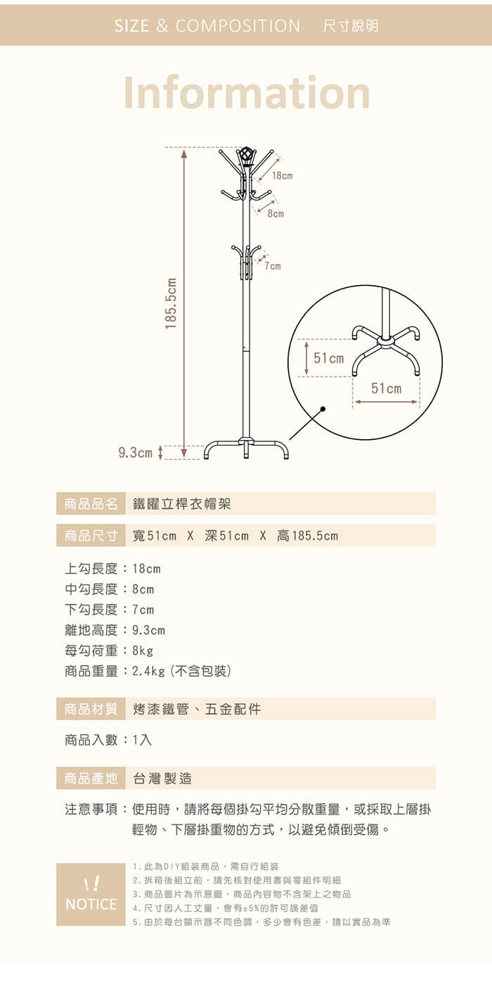 - 主商品尺寸/規格/重量/密度:內容件數:鐵曜立桿衣帽架x1,共1入/組 材質:烤漆鐵管 尺寸:寬51cm x 深51cm x 高185.5cm 上勾長度:18cm 中勾長度:8cm 下勾長度:7cm 離地高度:9.3cm 每勾荷重:8KG 內含:鐵管、五金配件 重量:2.4KG ±5% (不含包裝) 產地:100%台灣製造 注意事項:使用時,請將每個掛勾平均分散重量,或採取上層掛輕物、下層掛重物的方式,以避免傾倒受傷。