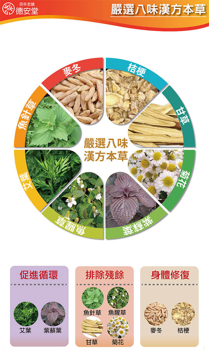- 材質/食材:內容物成分(如含有豬、牛成分請加註國別):水、艾葉、魚針草、麥冬、魚腥草、桔梗、甘草、紫蘇葉、菊花、紅糖