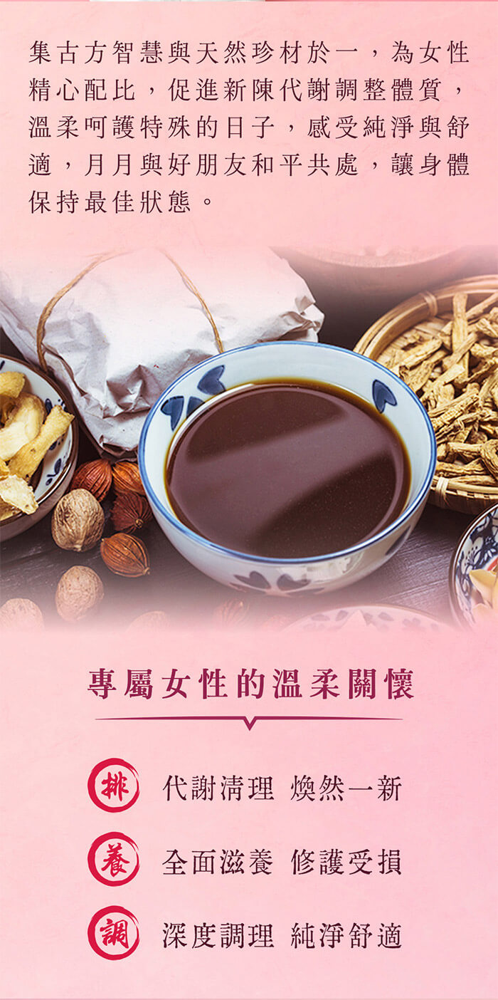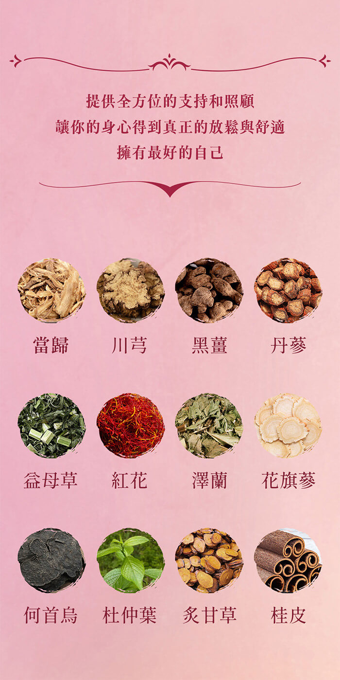 - 材質/食材:內容物成分(如含有豬、牛成分請加註國別):當歸、川芎、黑薑、丹蔘、益母草、紅花、澤蘭、花旗蔘、何首烏、杜仲葉、炙甘草、桂皮、黑糖。