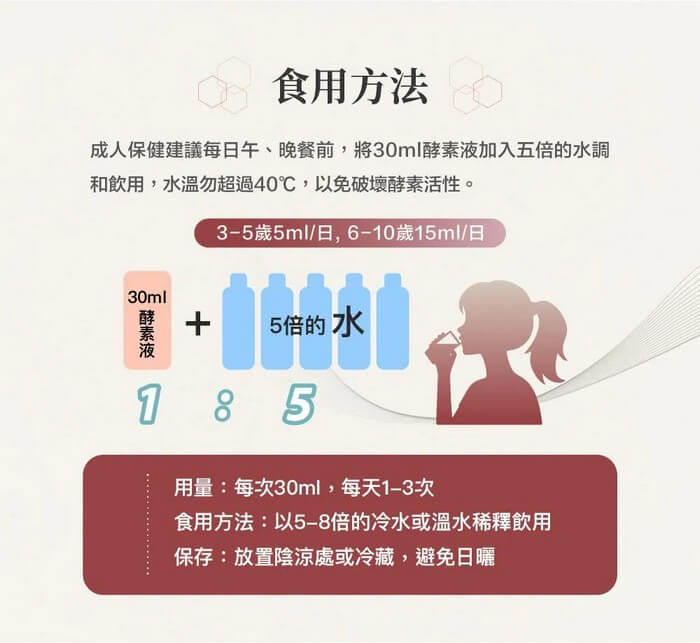 - 每日攝食方式/量:【食用方式】 建議每日午、晚餐前,將30ml酵素液加入五倍的水調和飲用,水溫勿超過40℃,以免破壞酵素活性。 【適用族群】 8歲以上全人群日常保健適用。 【保存期限】 24個月 【注意事項】 注意事項/藥品禁忌/緊急處理方法/警告標示:請置於陰涼乾燥處,避免日曬,倒置或劇烈搖晃,放置於陰涼幹燥處,開封後請盡快食用完畢。如有沈澱物實屬正常現象,敬請安心飲用。請置於嬰幼兒不易取得之處。重大疾病服用藥物者、或是計劃接受藥物治療者、或孕乳婦應請教醫師或醫療專業人員後再食用。