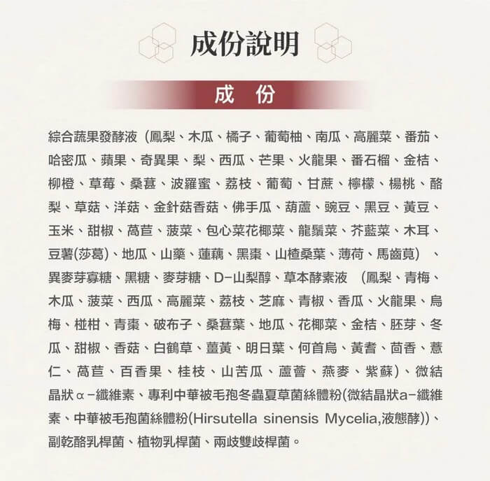 - 材質/食材:商品成分:綜合蔬果發酵液 (鳳梨、木瓜、橘子、葡萄柚、南瓜、高麗菜、番茄、哈密瓜、蘋果、奇異果、梨、西瓜、芒果、火龍果、番石榴、金桔、柳橙、草莓、桑葚、波羅蜜、荔枝、葡萄、甘蔗、檸檬、楊桃、酪梨、草菇、洋菇、金針菇香菇、佛手瓜、葫蘆、豌豆、黑豆、黃豆、玉米、甜椒、萵苣、菠菜、包心菜花椰菜、龍鬚菜、芥藍菜、木耳、豆薯(莎葛)、地瓜、山藥、蓮藕、黑棗、山楂桑葉、薄荷、馬齒莧) 、異麥芽寡糖、黑糖、麥芽糖、D-山梨醇、草本酵素液 (鳳梨、青梅、木瓜、菠菜、西瓜、高麗菜、荔枝、芝麻、青椒、香瓜、火龍果、烏梅、椪柑、青棗、破布子、桑葚葉、地瓜、花椰菜、金桔、胚芽、冬瓜、甜椒、香菇、白鶴草、薑黃、明日葉、何首烏、黃耆、茴香、薏仁、萵苣、百香果、桂枝、山苦瓜、蘆薈、燕麥、紫蘇)、微結晶狀α-纖維素、專利中華被毛孢冬蟲夏草菌絲體粉(微結晶狀a-纖維素、中華被毛孢菌絲體粉(Hirsutella sinensis Mycelia,液態酵))、副乾酪乳桿菌、植物乳桿菌、兩歧雙歧桿菌。