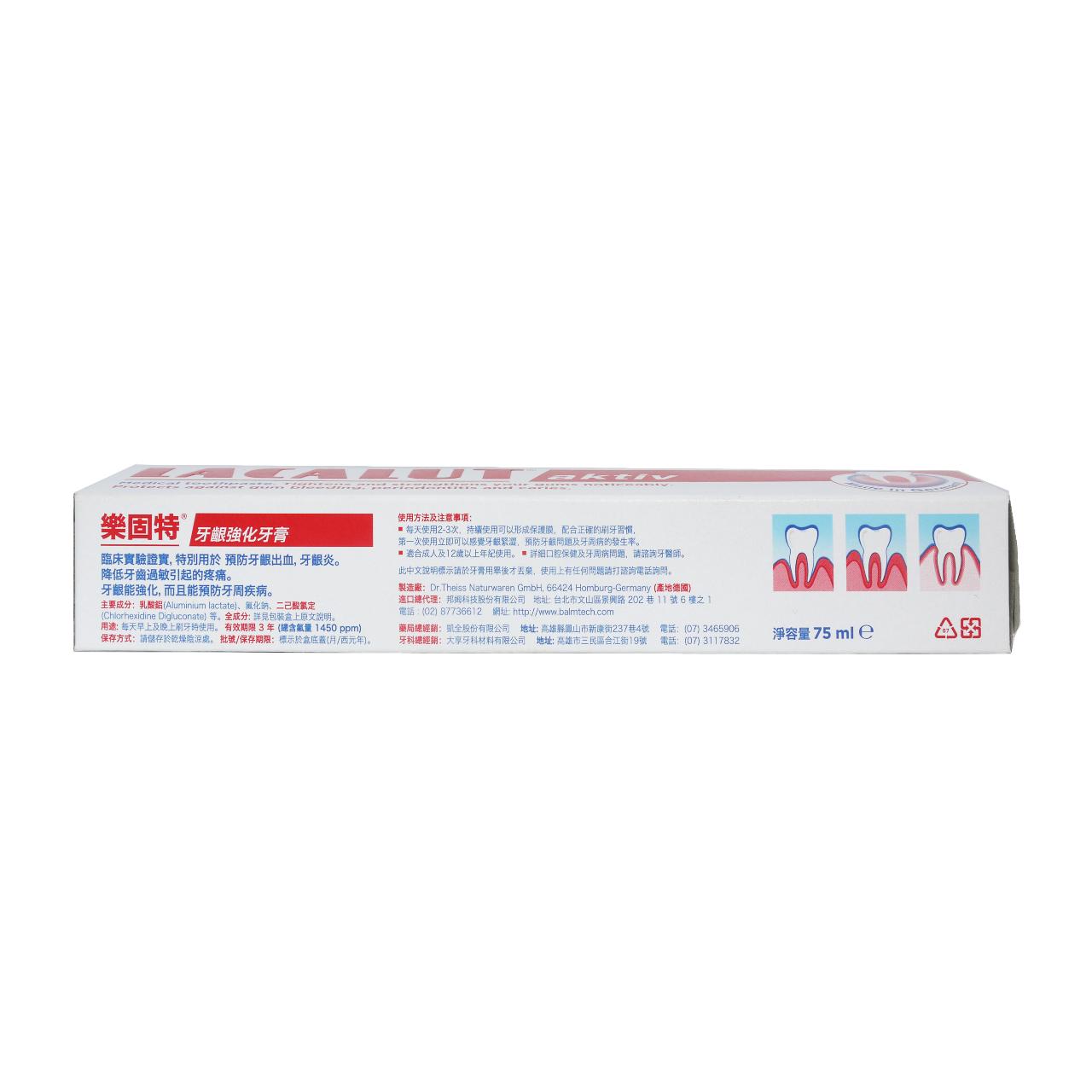 - 主商品:LACALUT AKTIV 樂固特牙齦強化牙膏75ML+牙刷(贈品)+小牙膏10ML 兩入 組合