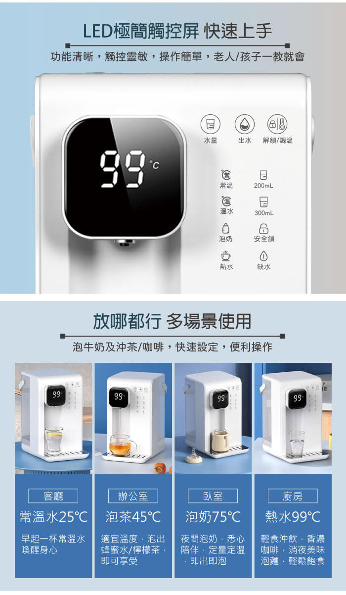 四種預設水溫,定量出水。