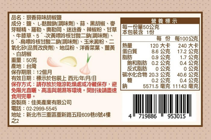 - 主商品尺寸/規格/重量:品名 : 狠香蒜味胡椒鹽 成份 : 鹽、 L-麩酸鈉(調味劑)、蒜、黑胡椒、麥芽糊精、羅勒、奧勒岡、迷迭香、辣椒粉、甘草、牛膝草、5′-次黃嘌呤核甘酸二鈉(調味劑)、5′-鳥嘌呤核甘酸二鈉(調味劑)、玉米澱粉、二氧化矽(品質改良劑)、地瓜粉、洋香菜葉、薑黃、白胡椒 食品添加物 : L-麩酸鈉(調味劑)、5′-次黃嘌呤核甘酸二鈉(調味劑)、5′-鳥嘌呤核甘酸二鈉(調味劑)、二氧化矽(品質改良劑) 規格 : 50g/包 保存期限:12個月 有效期限:標示於包裝上(西元 年/月/日) 有效日期說明:120天~365天,以消費者收受日起算,至少距有效日期前120日以上 保存方式:請存放於陰涼乾燥處或冷藏保存,避免陽光直曬、高溫與潮濕等環境。開封後請盡速食用完畢 產地:台灣 國際條碼: 4719886953015