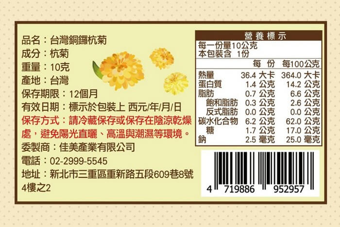- 主商品尺寸/規格/重量:品名 : 台灣銅鑼杭菊 成份:杭菊 規格:10g/包 保存期限:12個月 有效日期:標示於包裝上(西元 年/月/日) 有效日期說明:120天~365天,以消費者收受日起算,至少距有效日期前120日以上 保存方式:請冷藏保存或保存在陰涼乾燥處,避免陽光直曬、高溫與潮濕等環境 產地:台灣 國際條碼 : 4719886952957