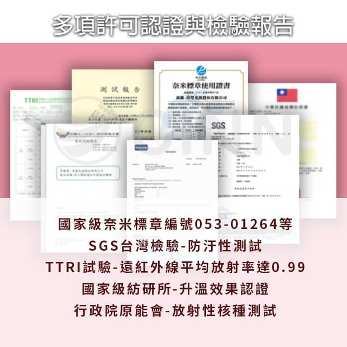產品獲奈米協會認證、SGS台灣檢驗、TTRI遠紅外線試驗。